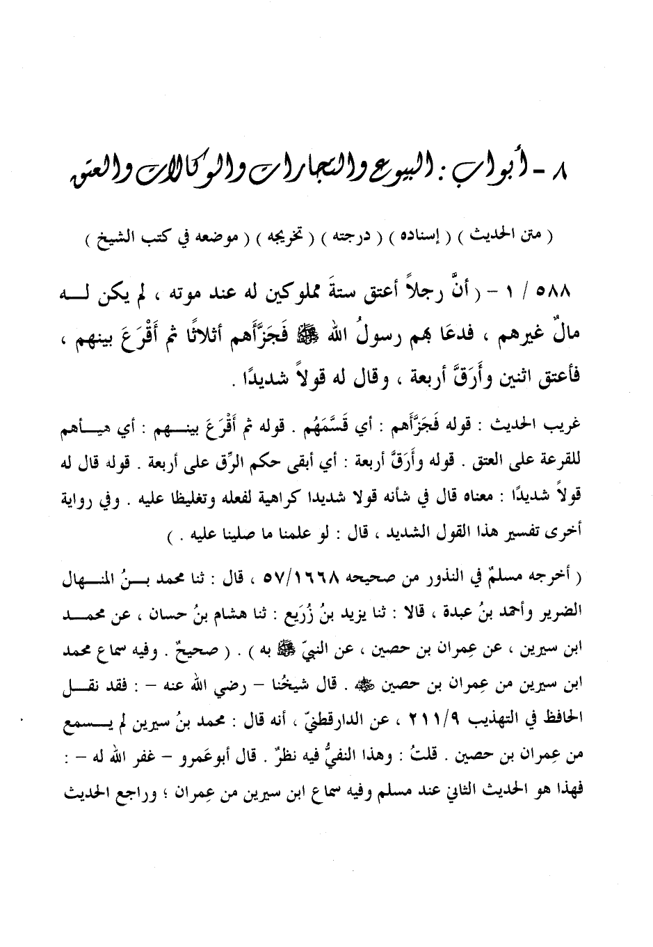 588/ 1 - (أنَّ رجلًا أعتق ستةَ مملوكين له عند موته، لم يكن له مالٌ غيرهم، فدعَا بهم رسولُ الله - صلى الله عليه وسلم - فَجَزَّأَهم أثلاثًا ثم أَقْرَعَ بينهم، فأعتق اثنين وأَرَقَّ أربعة، وقال له قولًا شديدًا.