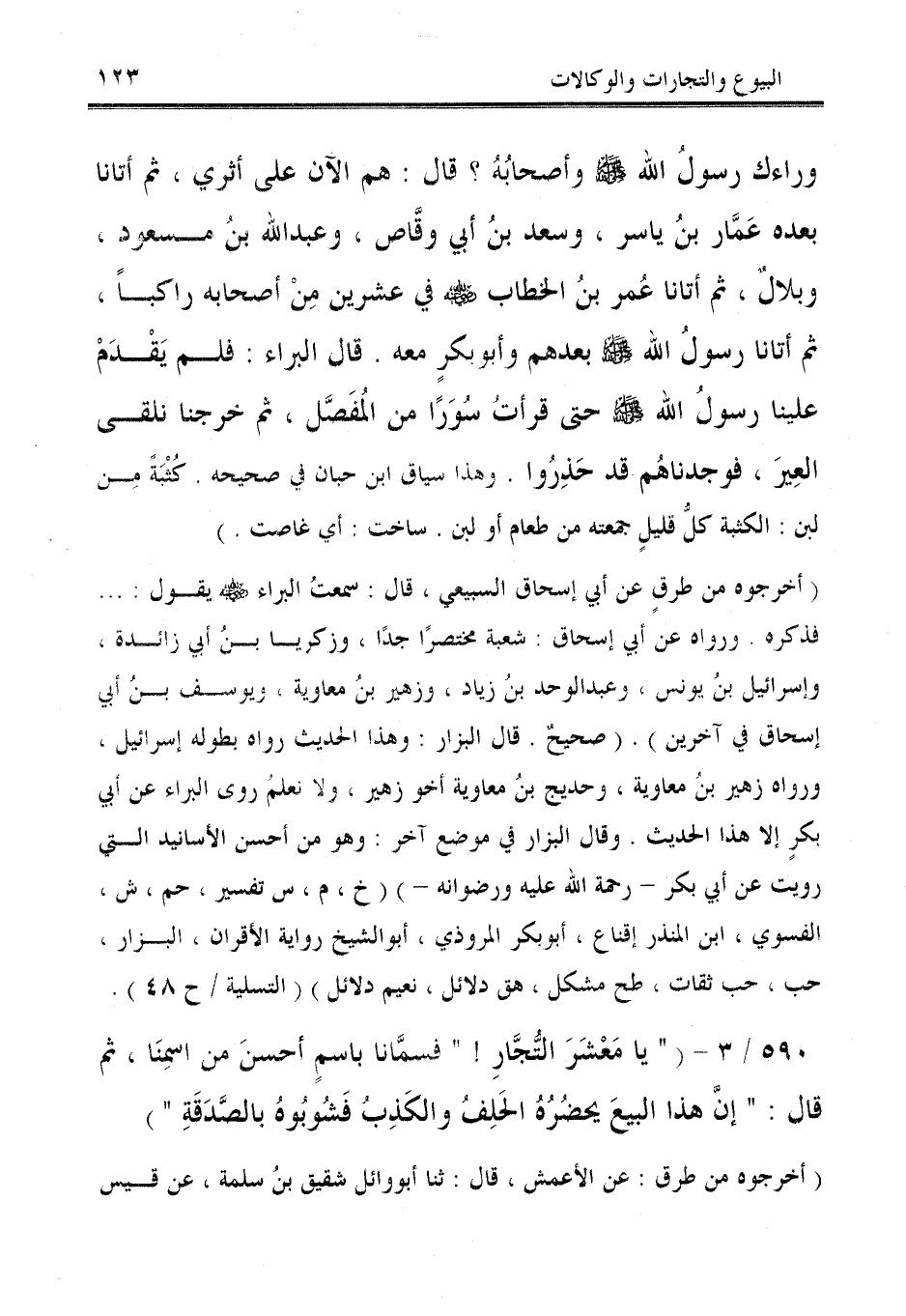 590/ 3 - ("يا مَعْشَرَ التُّجَّارِ! " فسمَّانا باسمٍ أحسنَ من اسمِنَا، ثم قال: "إنّ هذا البيعَ يحضُرُهُ الحَلِفُ والكَذِبُ فَشُوبُوهُ بالصَّدَقَةِ").