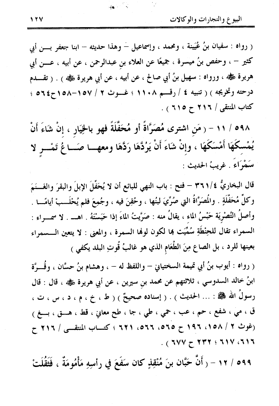 قال البخاريُّ 4/ 361 - فتح: باب النهي للبائع أن لا يُحَفِّلَ الإبلَ والبقرَ والغَنَمَ وكلِّ مُحَفَّلَةٍ. والمُصَرَّاةُ التي صُرِّيَ لبنُها، وحُقِنَ فيه، وجُمِعَ فلم يُحْلَبْ أيامًا. وأصلُ التَّصْرِيَة حَبْسُ الماءِ، يقالُ منه: صَرّيتُ الماءَ إذا حَبَسْتَهُ. اهـ. لا سمراء: السمراء تقال للحِنْطَةِ سُمِّيَت بها لكون لونها السمرة، والمعنى: لا يتعين السمراء بعينها للرد، بل الصاع مِنَ الطَّعَامِ الذي هو غالبُ قُوتِ البلد يكفي).