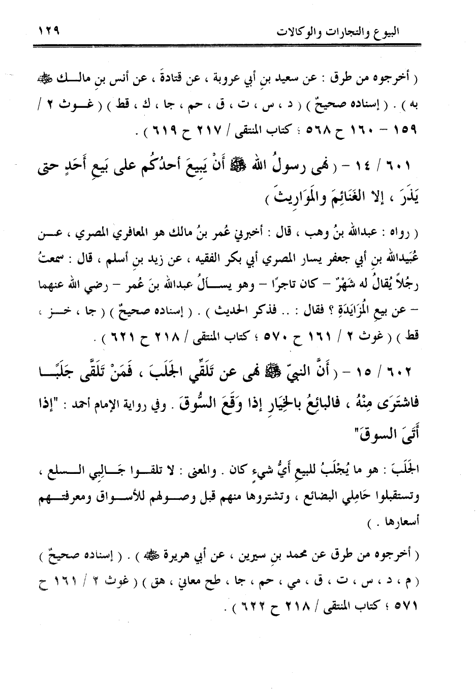 602/ 15 - (أَنَّ النبيّ - صلى الله عليه وسلم - نهى عن تَلَقِّي الجَلَبَ، فَمَنْ تَلَقَّى جَلَبًا فاشتَرَى مِنْهُ، فالبائِعُ بالخِيَارِ إذا وَقَعَ السُّوقَ. وفي رواية الإمام أحمد: "إذا أَتَىَ السوقَ"