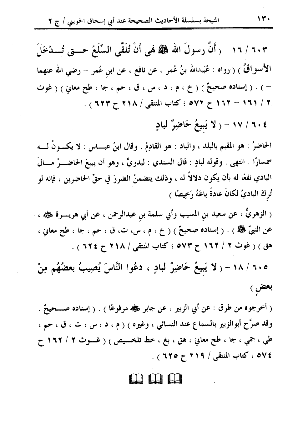 603/ 16 - (أَنَّ رسولَ الله - صلى الله عليه وسلم - نهى أَنْ تُلَقَّى السِّلَعُ حتى تُدْخَلَ الأسواقُ) (رواه: عُبيد الله بنُ عُمر، عن نافع، عن ابنِ عُمر - رضي الله عنهما -). (إسناده صحيحٌ) (خ، م، د، س، ق، حم، جا، طح معاني) (غوث 2/ 161 - 162 ح 572؛ كتاب المنتقى / 218 ح 623).