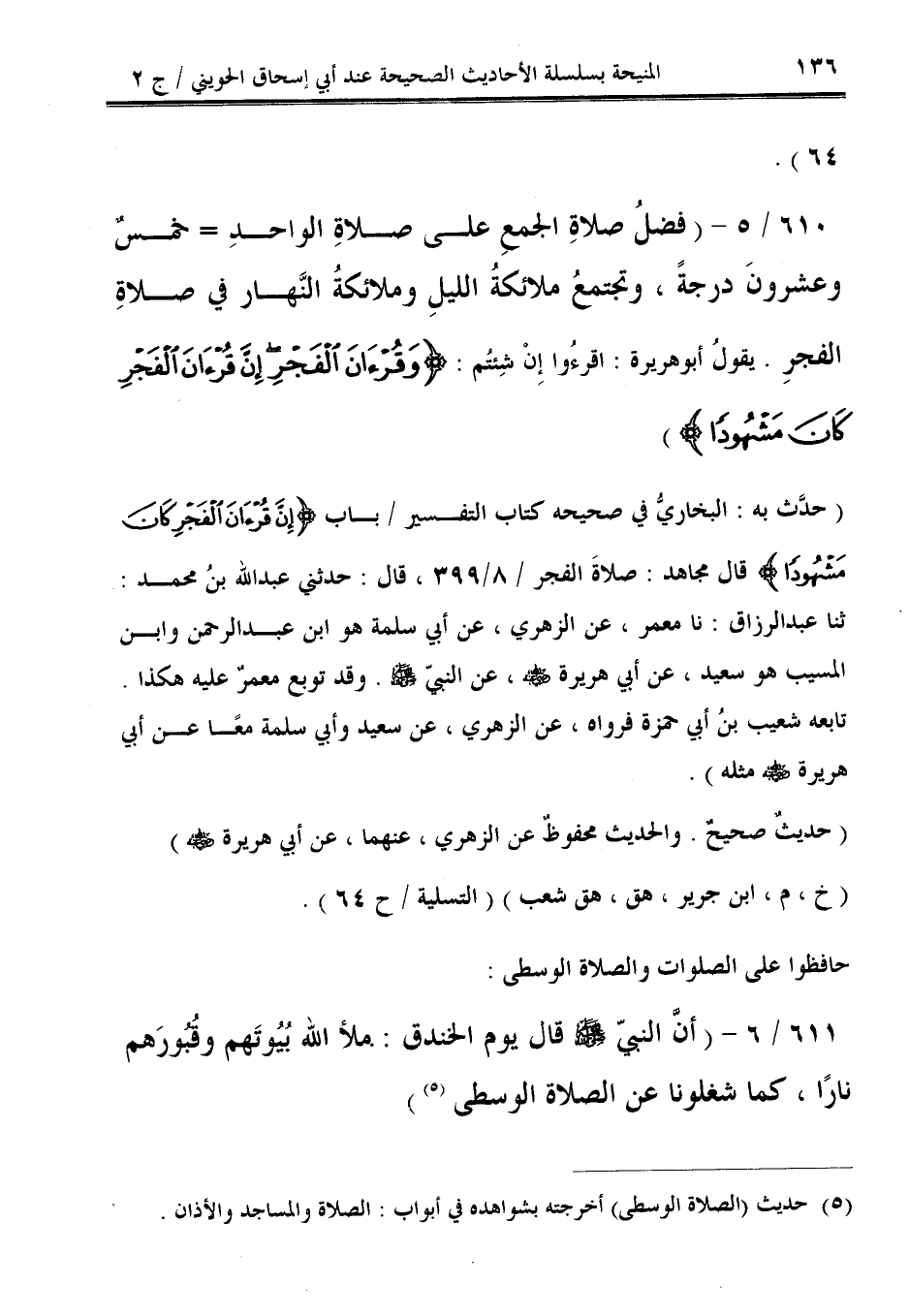 610/ 5 - (فضلُ صلاةِ الجمعِ على صلاةِ الواحدِ = خمسٌ وعشرونَ درجةً، وتجتمعُ ملائكة الليلِ وملائكةُ النَّهار في صلاةِ الفجرِ. يقولُ أبو هريرة: اقرءُوا إِنْ شِئتُم: {وَقُرْآنَ الْفَجْرِ إِنَّ قُرْآنَ الْفَجْرِ كَانَ مَشْهُودًا}).
