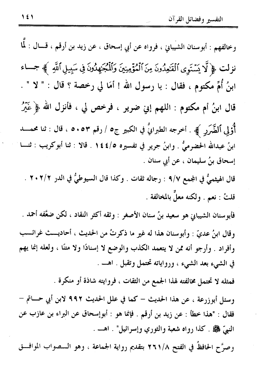 وخالفهم: أبو سنان الشيباني، فرواه عن أبي إسحاق، عن زيد بن أرقم، قال: لمَّا نزلت {لَا يَسْتَوِي الْقَاعِدُونَ مِنَ الْمُؤْمِنِينَ وَالْمُجَاهِدُونَ فِي سَبِيلِ اللَّهِ} جاء ابنُ أُمِّ مكتوم، فقال: يا رسول الله! أمَا لي رخصة؟ قال: "لا". قال ابنُ أم مكتوم: اللهم إني ضرير، فرخص لي، فأنزل الله {غَيْرُ أُولِي الضَّرَرِ}. أخرجه الطبرانيُّ في الكبير ج 5 / رقم 5053، قال: ثنا محمد ابنُ عبد الله الحضرميُّ. وابنُ جرير في تفسيره 5/ 144. قالا: ثنا أبو كريب: ثنا إسحاق بنُ سليمان، عن أبي سنان.