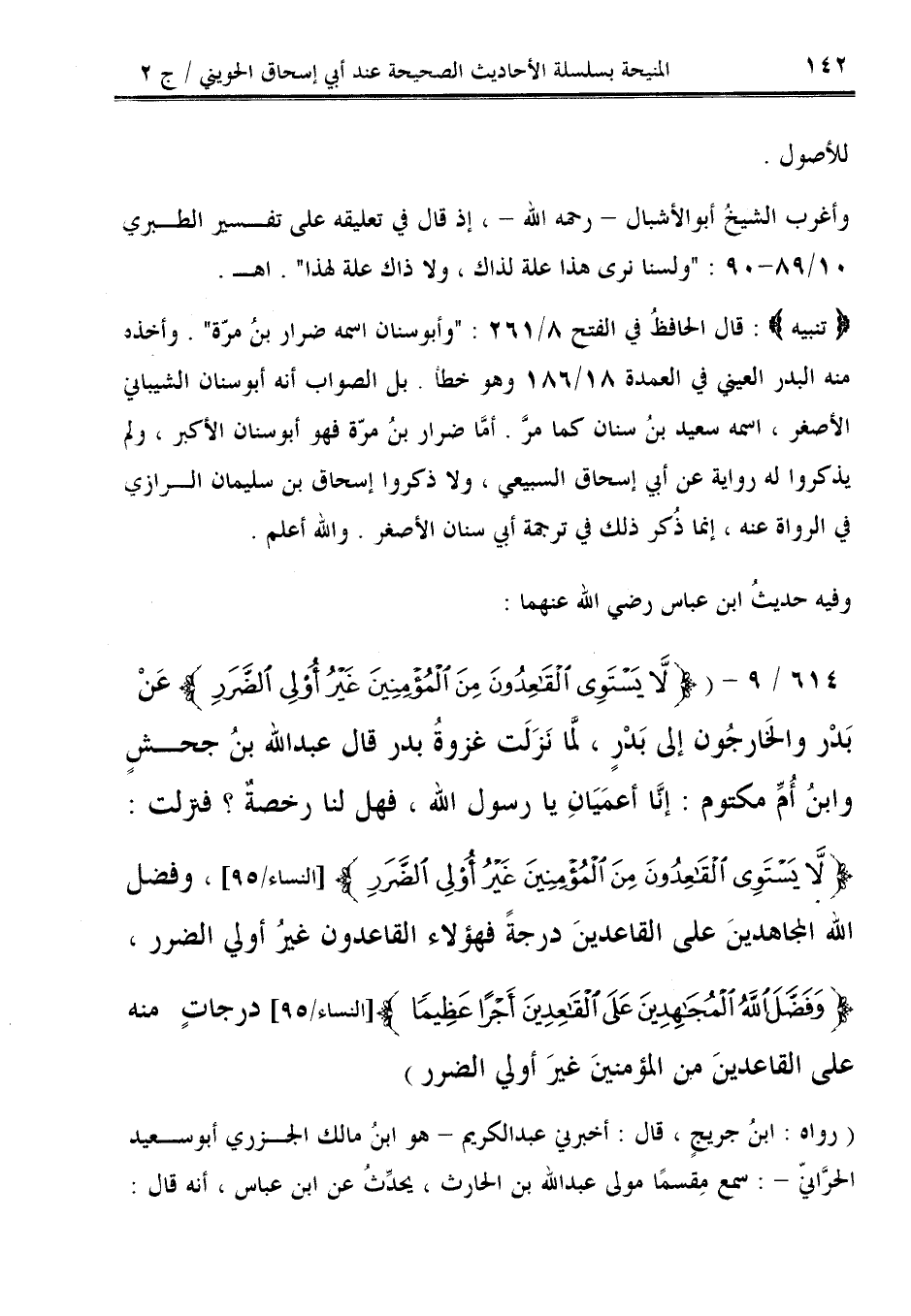614/ 9 - ({لَا يَسْتَوِي الْقَاعِدُونَ مِنَ الْمُؤْمِنِينَ غَيْرُ أُولِي الضَّرَرِ} عَنْ بَدْر والخَارجُون إلى بَدْرٍ، لمَّا نَزَلَت غزوةُ بدر قال عبد الله بنُ جحشٍ وابنُ أُمِّ مكتوم: إنَّا أعمَيَانِ يا رسول الله، فهل لنا رخصةٌ؟ فنزلت: {لَا يَسْتَوِي الْقَاعِدُونَ مِنَ الْمُؤْمِنِينَ غَيْرُ أُولِي الضَّرَرِ} [النساء / 95]، وفضل الله المجاهدينَ على القاعدينَ درجةً فهؤلاء القاعدون غيرُ أولي الضرر، {وَفَضَّلَ اللَّهُ الْمُجَاهِدِينَ عَلَى الْقَاعِدِينَ أَجْرًا عَظِيمًا} [النساء / 95] درجاتٍ منه على القاعدينَ من المؤمنينَ غيرَ أولي الضرر).