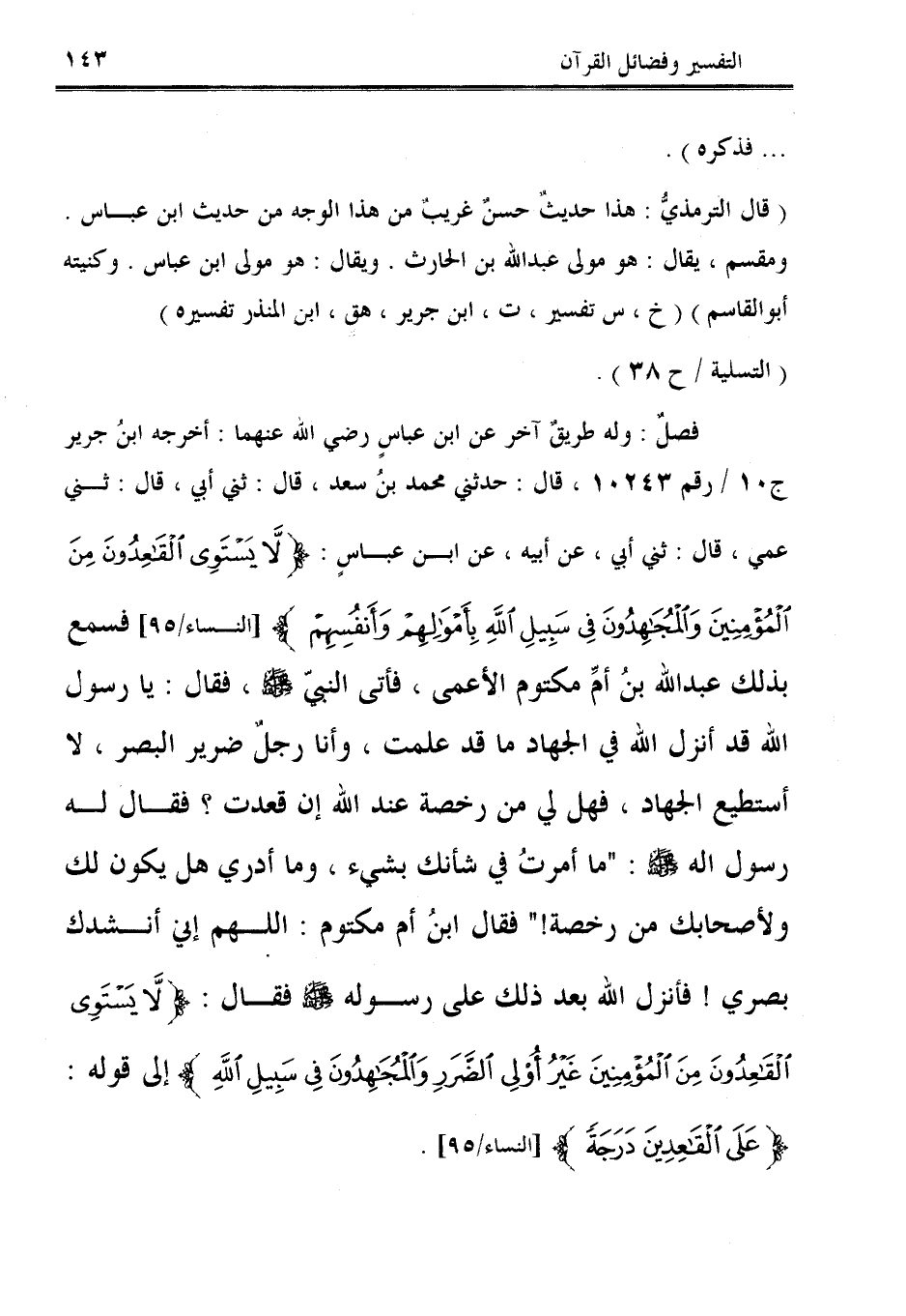 فصلٌ: وله طريقٌ آخر عن ابن عباسٍ رضي الله عنهما: أخرجه ابنُ جرير ج 10 / رقم 10243، قال: حدثني محمد بنُ سعد، قال: ثني أبي، قال: ثني عمي، قال: ثني أبي، عن أبيه، عن ابن عباسٍ: {لَا يَسْتَوِي الْقَاعِدُونَ مِنَ الْمُؤْمِنِينَ وَالْمُجَاهِدُونَ فِي سَبِيلِ اللَّهِ بِأَمْوَالِهِمْ وَأَنْفُسِهِمْ} [النساء / 95] فسمع بذلك عبد الله بنُ أمِّ مكتوم الأعمى، فأتى النبيّ - صلى الله عليه وسلم -، فقال: يا رسول الله قد أنزل الله في الجهاد ما قد علمت، وأنا رجلٌ ضرير البصر، لا أستطيع الجهاد، فهل لي من رخصة عند الله إن قعدت؟ فقال له رسول الله - صلى الله عليه وسلم -: "ما أمرتُ في شأنك بشيء، وما أدري هل يكون لك ولأصحابك من رخصة! " فقال ابنُ أم مكتوم: اللهم إني أنشدك بصري! فأنزل الله بعد ذلك على رسوله - صلى الله عليه وسلم - فقال: {لَا يَسْتَوِي الْقَاعِدُونَ مِنَ الْمُؤْمِنِينَ غَيْرُ أُولِي الضَّرَرِ وَالْمُجَاهِدُونَ فِي سَبِيلِ اللَّهِ بِأَمْوَالِهِمْ وَأَنْفُسِهِمْ} إلى قوله: {عَلَى الْقَاعِدِينَ دَرَجَةً} [النساء / 95].