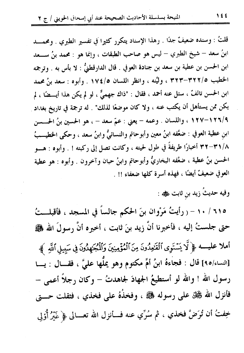 615/ 10 - (رأيتُ مَرْوان بنَ الحكم جالسًا في المسجد، فأقبلتُ حتى جلستُ إليه، فأخبرنا أنَّ زيد بنَ ثابت، أخبره أنَّ رسولَ الله - صلى الله عليه وسلم - أملا عليه {لَا يَسْتَوِي الْقَاعِدُونَ مِنَ الْمُؤْمِنِينَ وَالْمُجَاهِدُونَ فِي سَبِيلِ اللَّهِ} [النساء / 95]، قال: فجاءهُ ابنُ أمِّ مكتوم وهو يملُّها عليَّ، فقال: يا رسول الله! والله لو أستطيعُ الجهادَ لجاهدتُ -وكان رجلًا أعمى- فأنزل الله عز وجل على رسوله - صلى الله عليه وسلم -، وفخذُهُ على فخذي، فثقلت حتي خِفتُ أن تُرَضَّ فخذي، ثم سُرِّي عنه فأنزل الله تعالى {غَيْرُ أُولِي