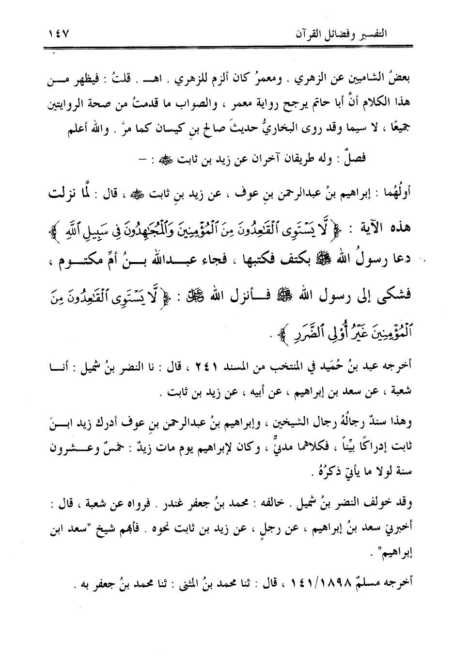 أولُهُما: إبراهيم بنُ عبد الرحمن بنِ عوف، عن زيد بنِ ثابت - رضي الله عنه -، قال: لمَّا نزلت هذه الآيه: {لَا يَسْتَوِي الْقَاعِدُونَ مِنَ الْمُؤْمِنِينَ وَالْمُجَاهِدُونَ فِي سَبِيلِ اللَّهِ} دعا رسولُ الله - صلى الله عليه وسلم - بكتف فكتبها, فجاء عبد الله بنُ أمِّ مكتوم، فشكى إلى رسول الله - صلى الله عليه وسلم - فأنزل الله - عز وجل -: {لَا يَسْتَوِي الْقَاعِدُونَ مِنَ الْمُؤْمِنِينَ غَيْرُ أُولِي الضَّرَرِ}.