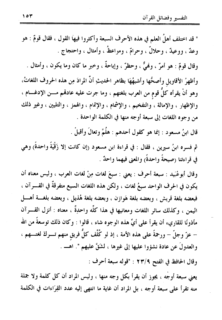 وقال الحافظ في الفتح 9/ 23: "قوله سبعة أحرف: