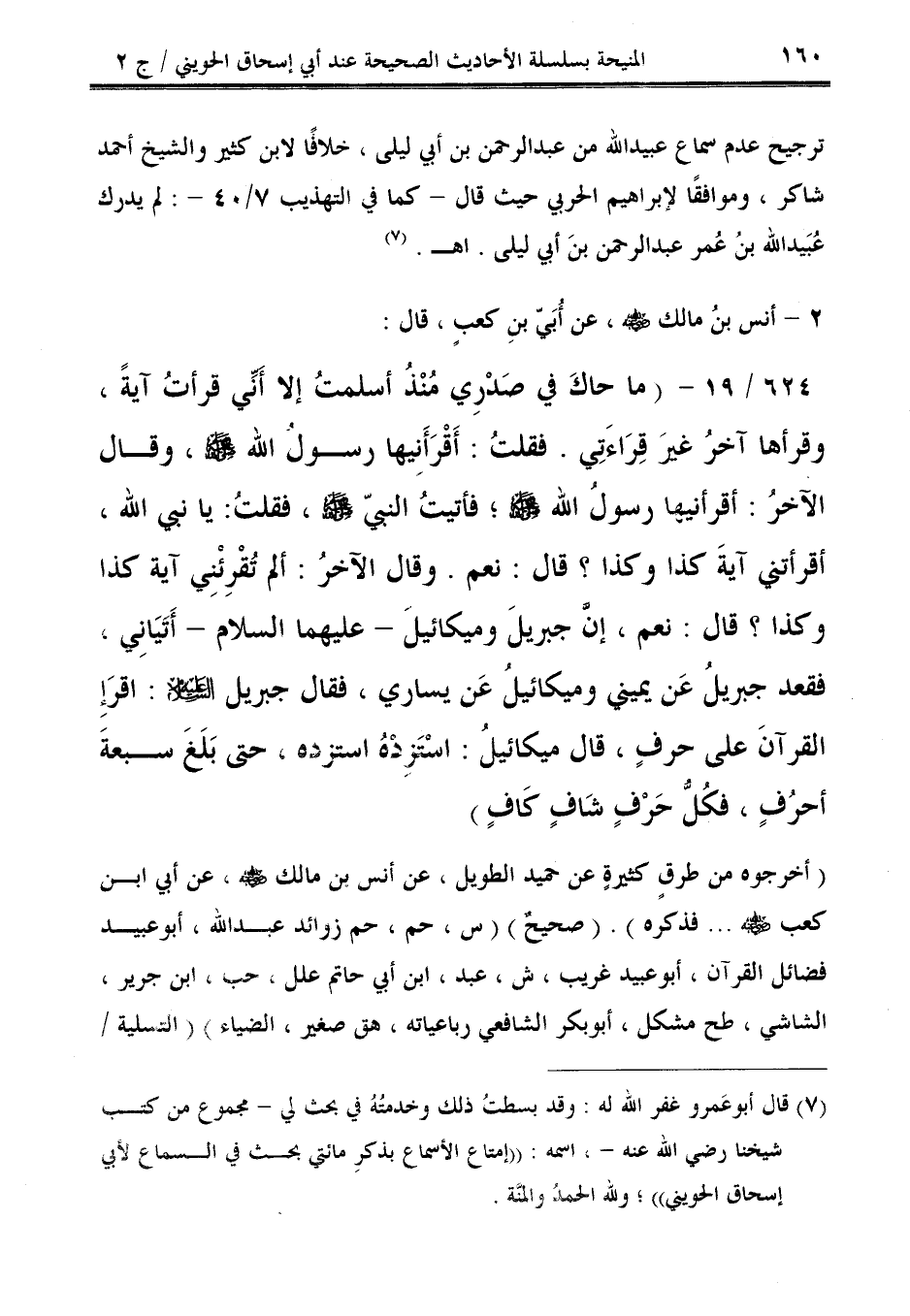 (¬7) قال أبو عَمرو غفر الله له: وقد بسطتُ ذلك وخدمتُهُ في بحث لي -مجموع من كتب شيخنا رضي الله عنه-، اسمه: "إمتاع الأسماع بذكرِ مائتي بحث في السماع لأبي إسحاق الحويني"؛ ولله الحمدُ والمنَّة.