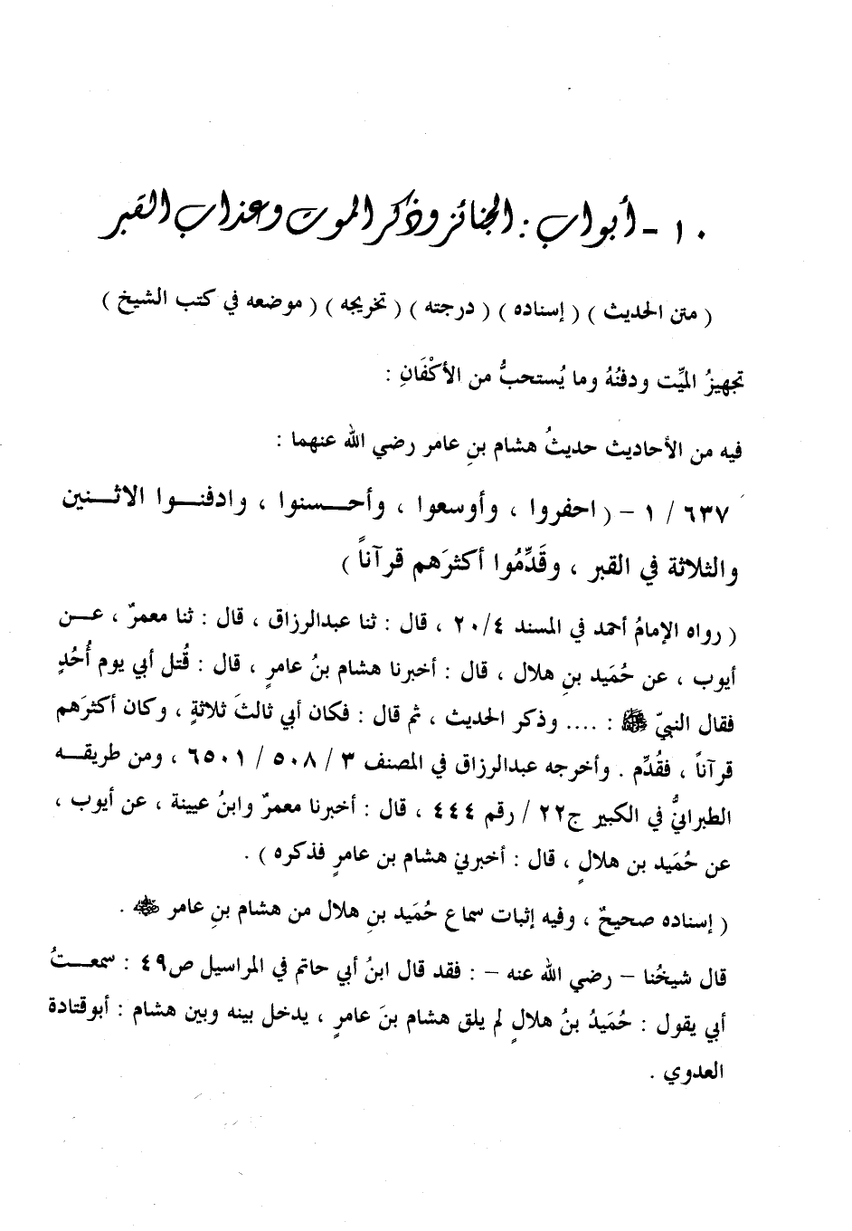 637/ 1 - (احفروا، وأوسعوا، وأحسنوا، وادفنوا الاثنين والثلاثة في القبر، وقَدِّمُوا أكثرَهم قرآنًا).