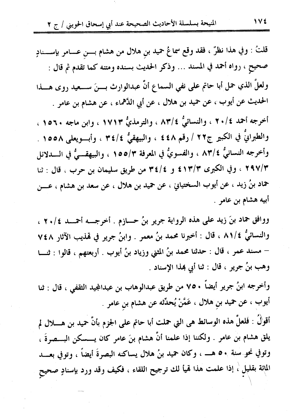أقول: فلعلَّ هذه الوسائط هي التي حملت أبا حاتم على الجزم بأنَّ حميد بن هلال لم يلق هشام بن عامر. ولكننا إذا علمنا أنَّ هشام بنَ عامر كان يسكن البصرةَ، وتوفي نحو سنة 50 هـ، وكان حميد بنُ هلال يساكنه البصرةَ أيضًا، وتوفي بعد المائة بقليلٍ، إذا علمت هذا تهيأ لك ترجيح اللقاء، فكيف وقد ورد بإسنادٍ صحيحٍ