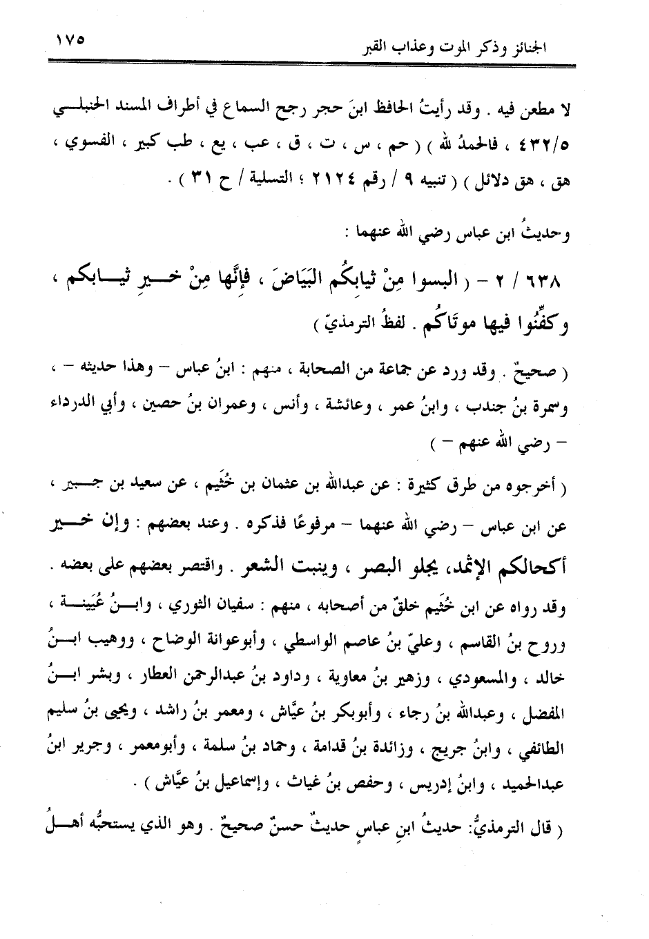 638/ 2 - (البسوا مِنْ ثيابِكُم البَيَاضَ، فَإنَّها مِنْ خيرِ ثيابكم، وكفِّنُوا فيها موتَاكُم. لفظُ الترمذيّ).