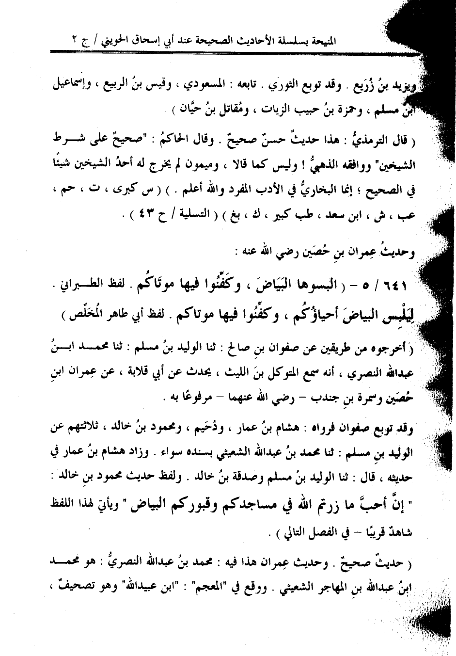 641/ 5 - (البسوها البَيَاضَ، وكَفِّنُوا فيها موتَاكُم. لفظ الطبراني. لِيَلْبِس البياضَ أحياؤُكُم، وكفِّنُوا فيها موتاكم. لفظ أبي طاهر المُخَلِّص).