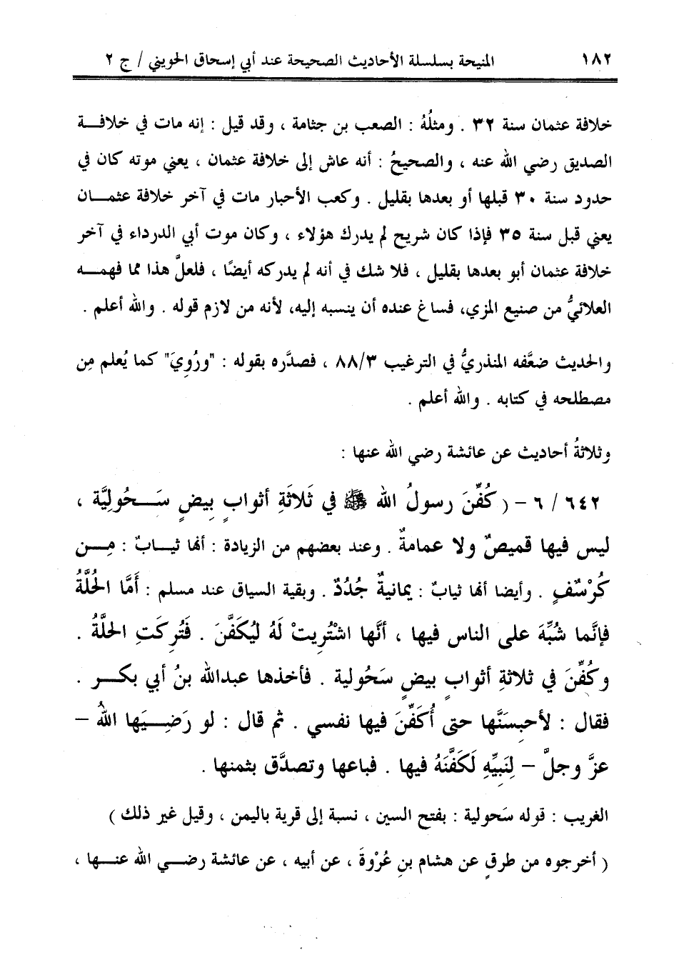 642/ 6 - (كُفِّنَ رسولُ الله - صلى الله عليه وسلم - في ثَلاَثَةِ أثوابٍ بِيضٍ سَحُولِيَّة، ليس فيها قميصٌ ولا عمامةٌ. وعند بعضهم من الزيادة: أنها ثيابٌ: مِن كُرْسُفٍ. وأيضًا أنها ثيابٌ: يمانيةٌ جُدُدٌ. وبقية السياق عند مسلم: أَمَّا الحُلَّةُ فإنَّما شُبِّهَ على الناس فيها، أنَّها اشْتُرِيتْ لَهُ ليُكَفَّنَ. فَتُرِكَتِ الحلَّةُ. وكُفِّنَ في ثلاثةِ أثوابٍ بيضٍ سَحُولية. فأخذها عبد الله بنُ أبي بكر. فقال: لأحبِسَنَّها حتى أُكَفِّنَ فيها نفسي. ثم قال: لو رَضِيَها الله -عزَّ وجلَّ- لِنَبِيِّهِ لَكَفَّنَهُ فيها. فباعها وتصدَّق بثمنها.