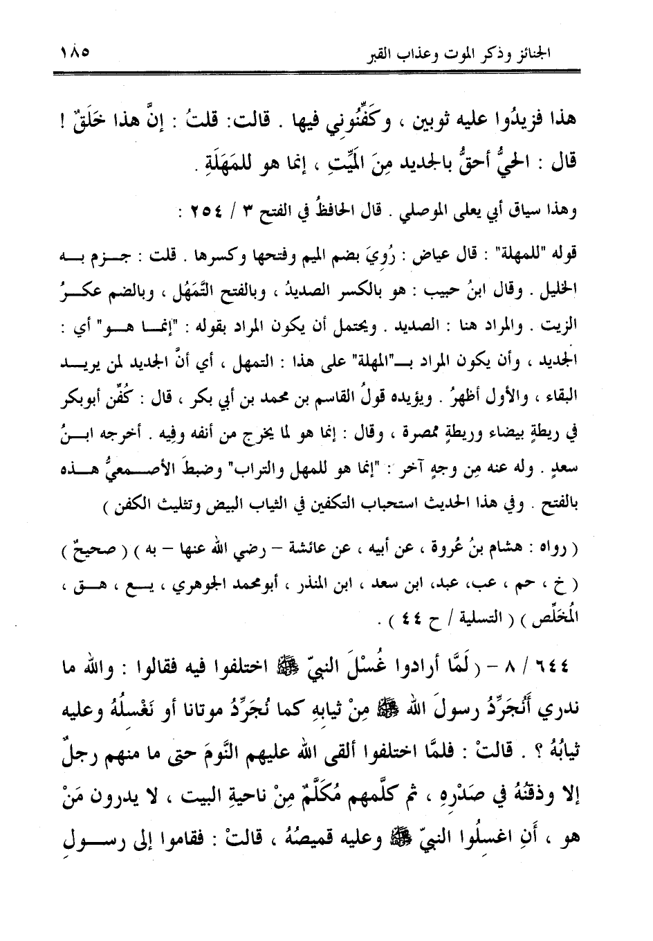 644/ 8 - (لَمَّا أرادوا غُسْلَ النبيّ - صلى الله عليه وسلم - اختلفوا فيه فقالوا: والله ما ندري أَنُجَرِّدُ رسولَ الله - صلى الله عليه وسلم - مِنْ ثيابِهِ كما نُجَرِّدُ موتانا أو نَغْسِلُهُ وعليه ثيابُهُ؟. قالتْ: فلمَّا اختلفوا ألقى الله عليهم النَّومَ حتى ما منهم رجلٌ إلا وذقنُهُ في صَدْرِهِ، ثم كلَّمهم مُكَلَّمٌ مِنْ ناحيةِ البيت، لا يدرون مَنْ هو، أَنِ اغسِلُوا النبيّ - صلى الله عليه وسلم - وعليه قميصُهُ، قالتْ: فقاموا إلى رسولِ