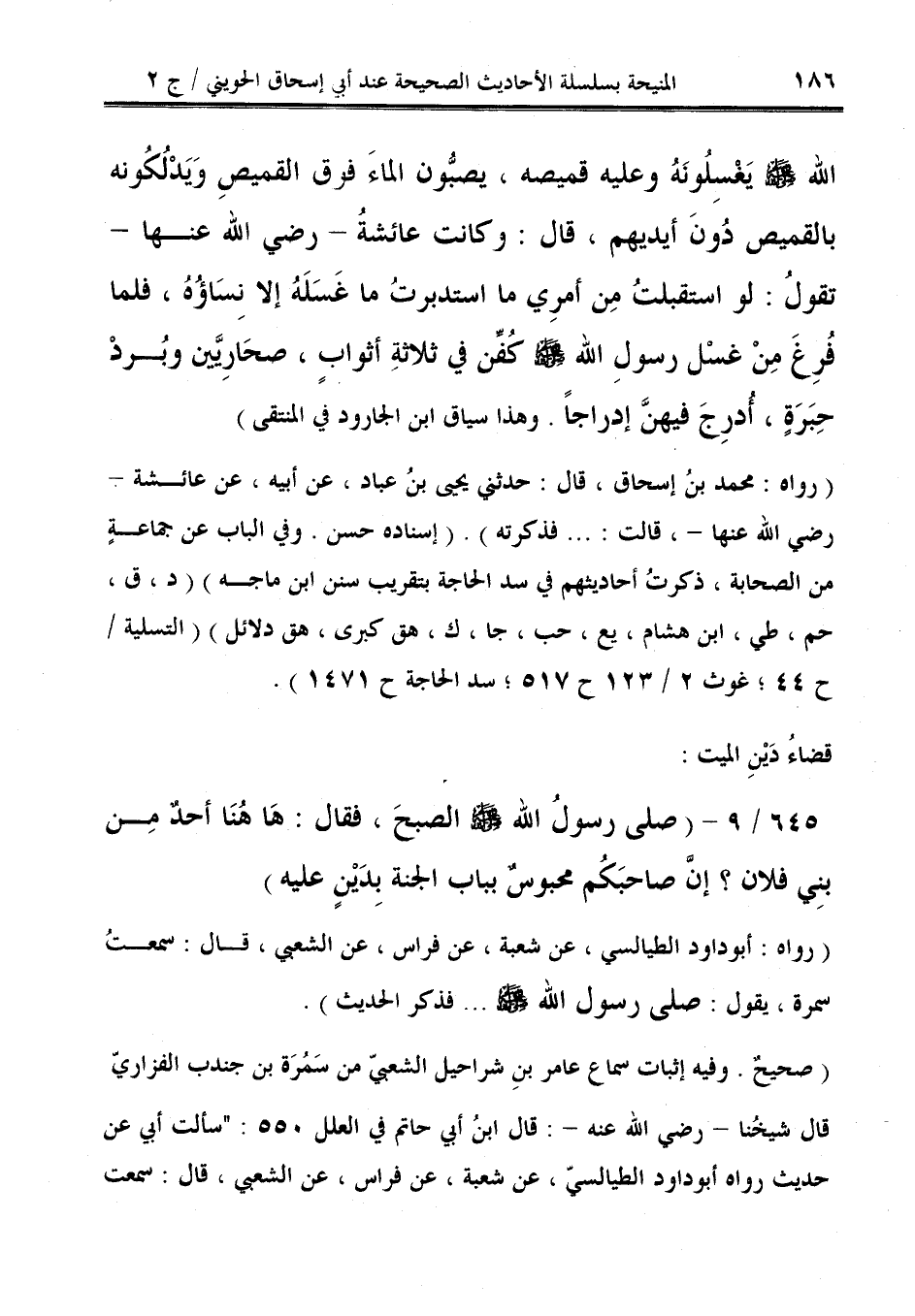 (رواه: محمد بنُ إسحاق، قال: حدثني يحيى بنُ عباد، عن أبية، عن عائشة - رضي الله عنها -، قالت: ... فذكرته). (إسناده حسن. وفي الباب عن جماعةٍ من الصحابة، ذكرتُ أحاديثهم في سد الحاجة بتقريب سنن ابن ماجه) (د، ق، حم، طي، ابن هشام، يع، حب، جا، ك، هق كبرى، هق دلائل) (التسلية / ح 44؛ غوث 2/ 123 ح 517؛ سد الحاجة ح 1471).