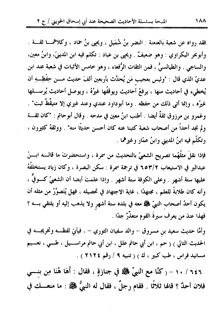 فإذا نقلَ مثلُهُما تصريح الشعبيّ بالتحديث من سمرة، واستحضرتَ ما قاله ابنُ عبد البر في الاستيعاب 2/ 653 في ترجمة سمرة: سكن البصرة، وكان زياد يستخلفُهُ عليها ستة أشهر. وعلى الكوفة ستة أشهر. وإذا علمتَ أيضًا أن الشعبيّ كوفيٌّ، وأنه كان طلابةً للعلم، مجتهدًا، غاية الاجتهاد في تحصيله، فهل يُتَصوَّرُ من مثله أن يكون أحدُ أصحابِ النبيّ - صلى الله عليه وسلم - معه في بلده ستة أشهرٍ ولا يذهب إليه أو يلتقي به؟ فهذا عندَ من يعرف سيرةَ القوم متعذِّرٌ جدًّا.