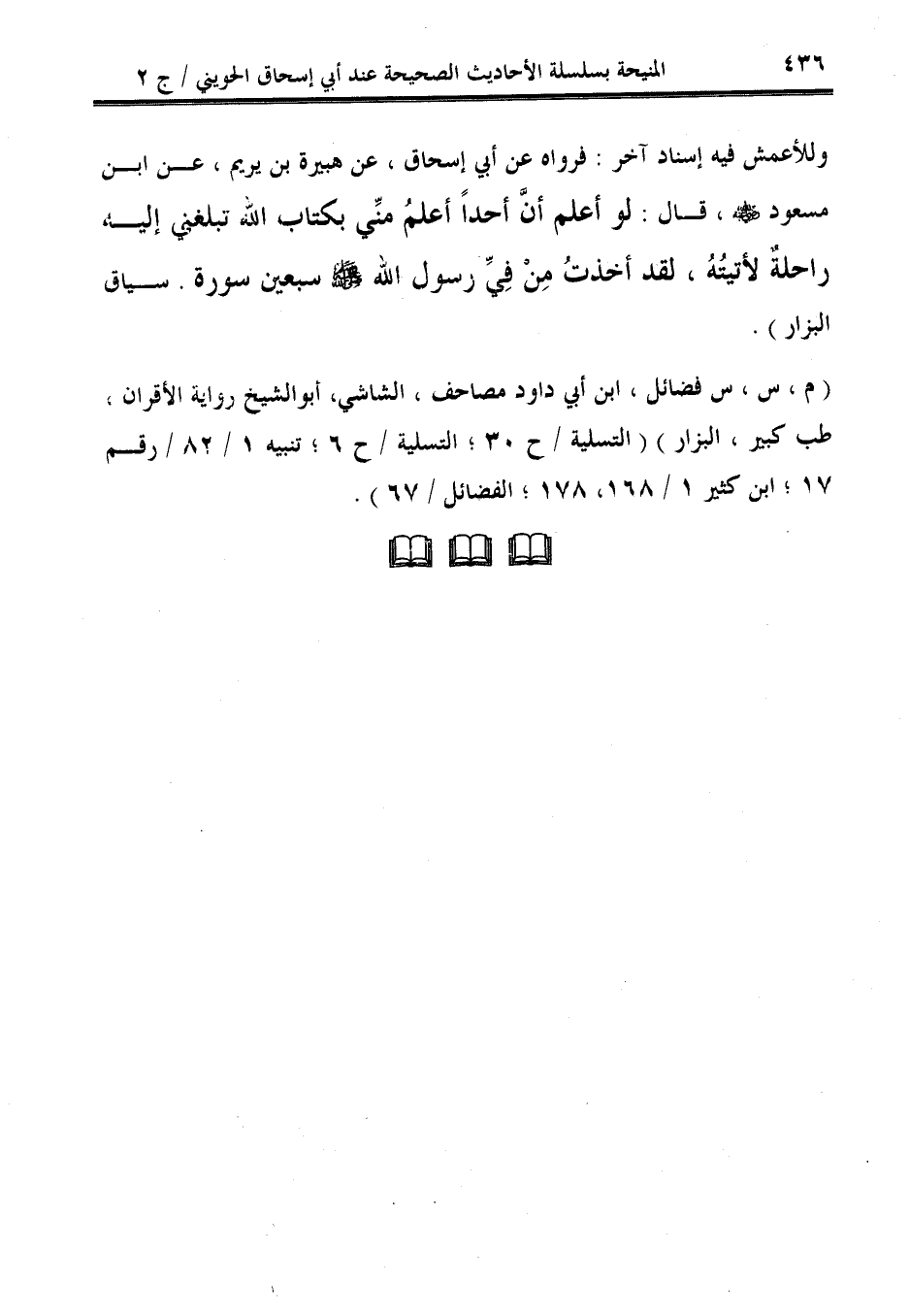 (م، س، س فضائل، ابن أبي داود مصاحف، الشاشي، أبو الشيخ رواية الأقران, طب كبير، البزار) (التسلية / ح 30، التسلية / ح 6، تنبيه 1/ 82 / رقم 17؛ ابن كثير 1/ 168، 178؛ الفضائل / 67).