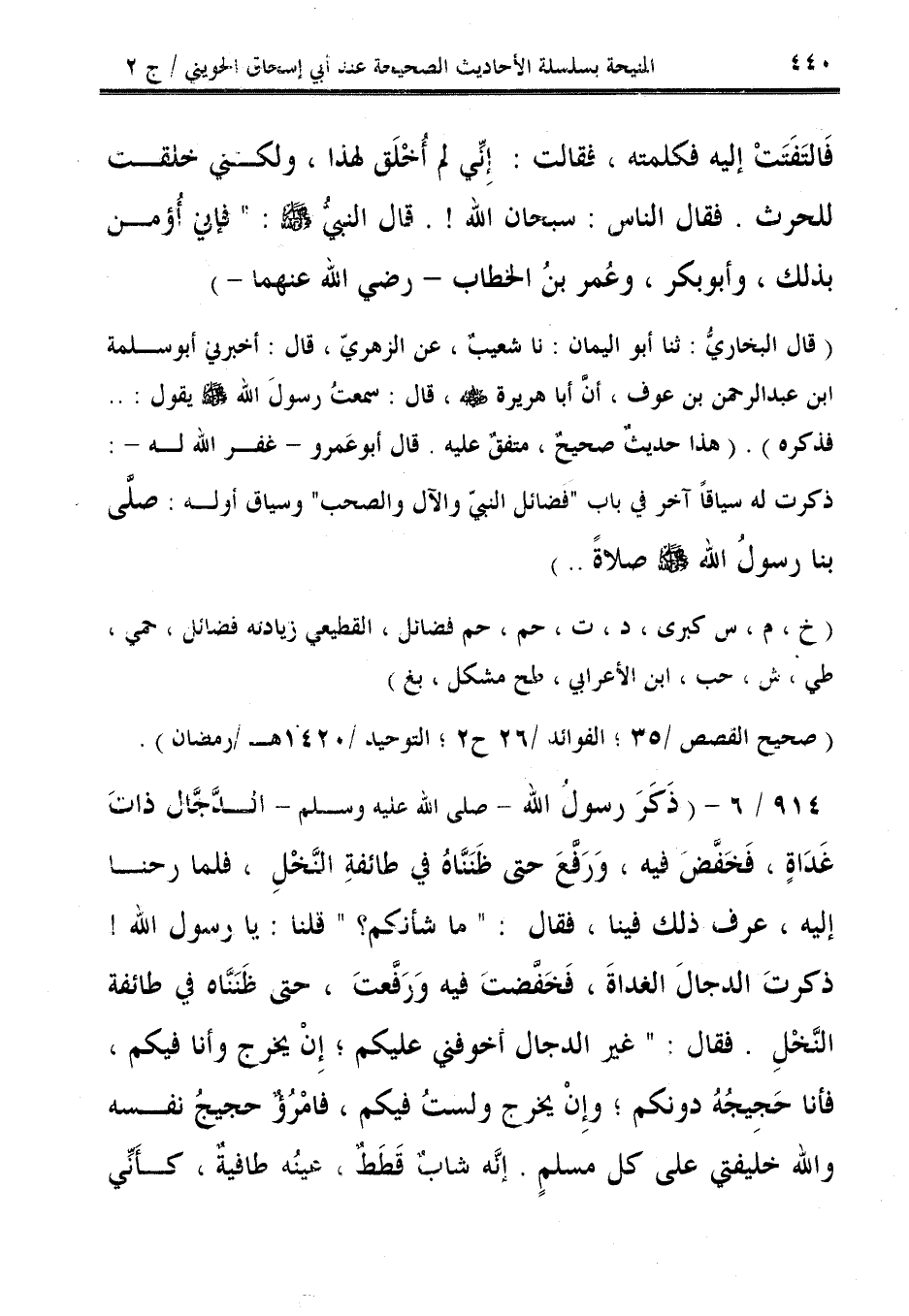 914/ 6 - (ذَكَرَ رسولُ الله - صلى الله عميه وسلم - الدجال ذاتَ غَدَاةٍ، فَخَفَّضَ فيه، وَرَفَّعَ حتى ظَنَنَّاهُ في طائفةِ النَّخْلِ، فلما رحنا إليه، عرف ذلك فينا، فقال: "ما شأنكم؟ " قلنا: يا رسول الله! ذكرتَ الدجالَ الغداةَ، فخَفَّضت فيه وَرَفَّعتَ، حتى ظَنَنَّاه في طائفة النَّخْلِ. فقال: "غير الدجال أخوفني عليكم؛ إِنْ يخرج وأنا فيكم، فأنا حَجِيجُهُ دونكم؛ وإِنْ يخرح ولستُ فيكم، فامْرُؤٌ حجيجُ نفسه والله خليفتي على كل مسلمٍ. إنَّه شابٌ قَطَطٌ، عينُه طافيةٌ، كأَنِّي
