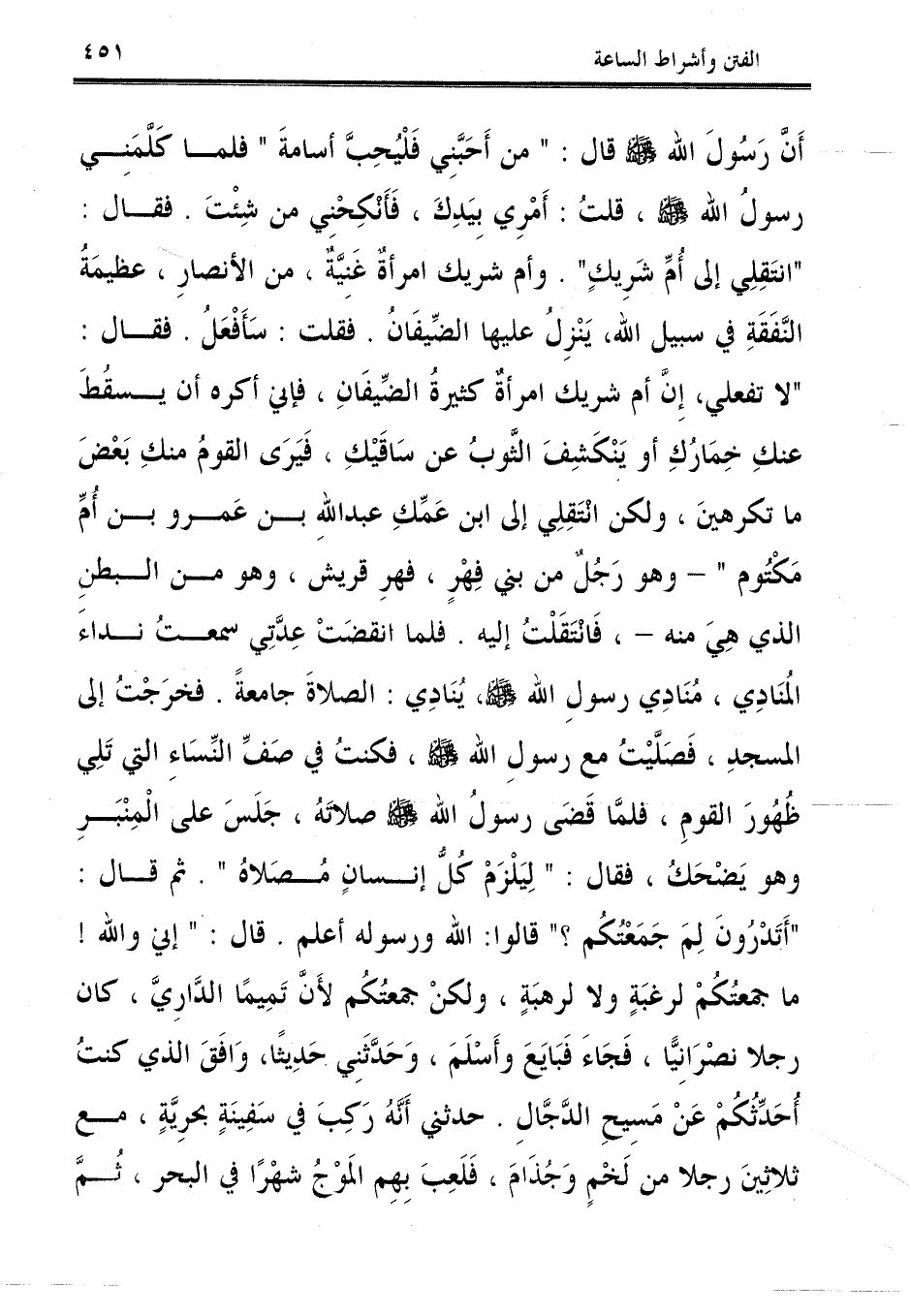 أَنَّ رسولُ الله - صلى الله عليه وسلم -قال أحَبَّني فَلْيُجِبَّ أسامةَ" فلما كَلَّمني أَنَّ رسولُ الله - صلى الله عليه وسلم -، قلتُ: أَمْرِي بِيَدِكَ، فَاَنكحْنِي من شِئْتَ. فقال: "انتَقِلِي إلى أُمِّ شَرِيكٍ". وأم شريك امرأةٌ غَنِيَّةٌ، من الأنصارِ، عظيمَةُ النَّفَقَةِ في سبيل الله، يَنْزِلُ عليها الضِّيفَانُ. فقلت: سَأَفْعَلُ. فقال: "لا تفعلي، إِنَّ أم شريك امرأة كثيرةُ الضِّيفَانِ، فإني أكره أن يسقُطَ عنكِ خِمَارُكِ أو يَنْكَشِفَ الثَّوبُ عن سَاقَيْكِ، فَيَرَى القومُ منكِ بَعْضَ ما تكرهينَ، ولكن انتَقِلِي إلى ابن عَمِّكِ عبد اللهِ بن عَمرو بن أُمِّ مَكْتُوم" -وهو رَجُلٌ من بني فِهْرٍ، فهرِ قريش، وهو من البطنِ الذي هِيَ منه-، فَانْتَقَلْتُ إليه. فلما انقضَتْ عِدَّتِي سمعتُ نداءَ المُنَادِي، مُنَادِي رسولِ الله - صلى الله عليه وسلم -، يُنَادِي: الصلاةَ جامعةً. فخرجْتُ إلى المسجدِ، فَصَلَّيْتُ مع رسولِ الله - صلى الله عليه وسلم -، فكنتُ في صَفِّ النِّساءِ التي تَلِي ظُهُورَ القومِ، فلمَّا قَضَى رسولُ الله - صلى الله عليه وسلم - صلاَتهُ، جَلَسَ على الْمِنْبَرِ وهو يَضْحَكُ، فقال: "لِيَلْزَمْ كُلُّ إنسانٍ مُصَلاهُ". ثم قال: "أَتَدْرُونَ لِمَ جَمَعْتُكُم؟ " قالوا: الله ورسوله أعلم. قال: "إلي والله ما جمعتُكُمْ لرغبَةٍ ولا لرهبَةٍ، ولكنْ جمعتُكُم لأَنَّ تَمِيمًا الدَّارِيُّ، كان رجلا نصْرَانِيًّا، فَجَاءَ فَبَايَعَ وأَسْلَمَ، وَحَدَّثَنِي حَدِيثًا، وَافَقَ الذي كنتُ أُحَدِّثُكُمْ عَنْ مَسِيحِ الدَّجَّالِ. حدثنه أَنَّهُ رَكِبَ في سَفِينَةٍ بحرِيَّةٍ، مع ثلاِثينَ رجلا من لَخْمِ وَجُذَامَ، فَلَعِبَ بِهِم المَوْجُ شهْرًا في البحر، ثُمَّ