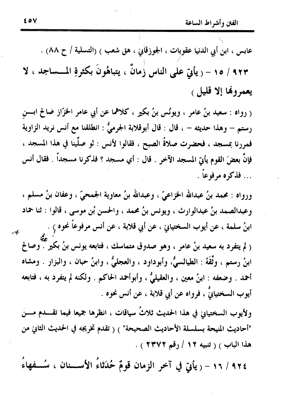 923/ 15 - (يأتي على الناس زمانٌ، يتباهُونَ بكثرةِ المساجد، لا يعمرونها إلا قليل).