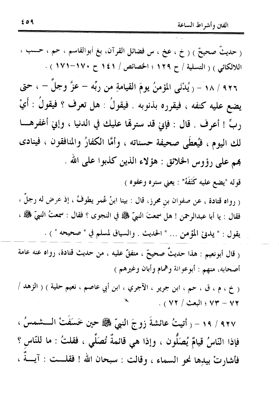 926/ 18 - (يُدْنَى المؤمنُ يومَ القيامةِ من ربِّه -عزَّ وجلّ-، حتى يضع عليه كنفه، فيقرره بذنوبه. فيقولُ: هل تعرف؟ فيقولُ؟ أَيْ ربِّ! أعرف. قال: فإني قد سترتها عليك في الدنيا، وإني أغفرها لك اليوم، فيُعطَى صحيفة حسناته، وأمَّا الكفارُ والمنافقون، فينادى بهم على رؤوس الخلائق: هؤلاء الذين كذبوا على الله.