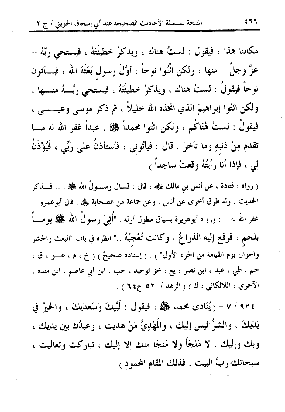 (رواه: قتادة، عن أنس بنِ مالك - رضي الله عنه -، قال: قال رسولُ الله - صلى الله عليه وسلم -:. . فذكر الحديث. وله طرق أخرى عن أنس. وعن جماعة من الصحابة - رضي الله عنهم -. قال أبو عمرو -غفر الله له-: ورواه أبو هريرة بسياق مطول أوله: "أُتِيَ رسولُ الله - صلى الله عليه وسلم - يومًا بلحمٍ، فرفع إليه الذراعُ، وكانت تُعْجِبُهُ. ." انظره في باب البعث والحشر وأحوال يوم القيامة من الجزء الأول"). (إسناده صحيحٌ) (ح، م، عو، ق، حم، طي، عبد، ابن نصر، يع، خز توحيد، حب، ابن أبي عاصم، ابن منده، الآجري، اللالكائي، ك) (الزهد /52 ح 64).