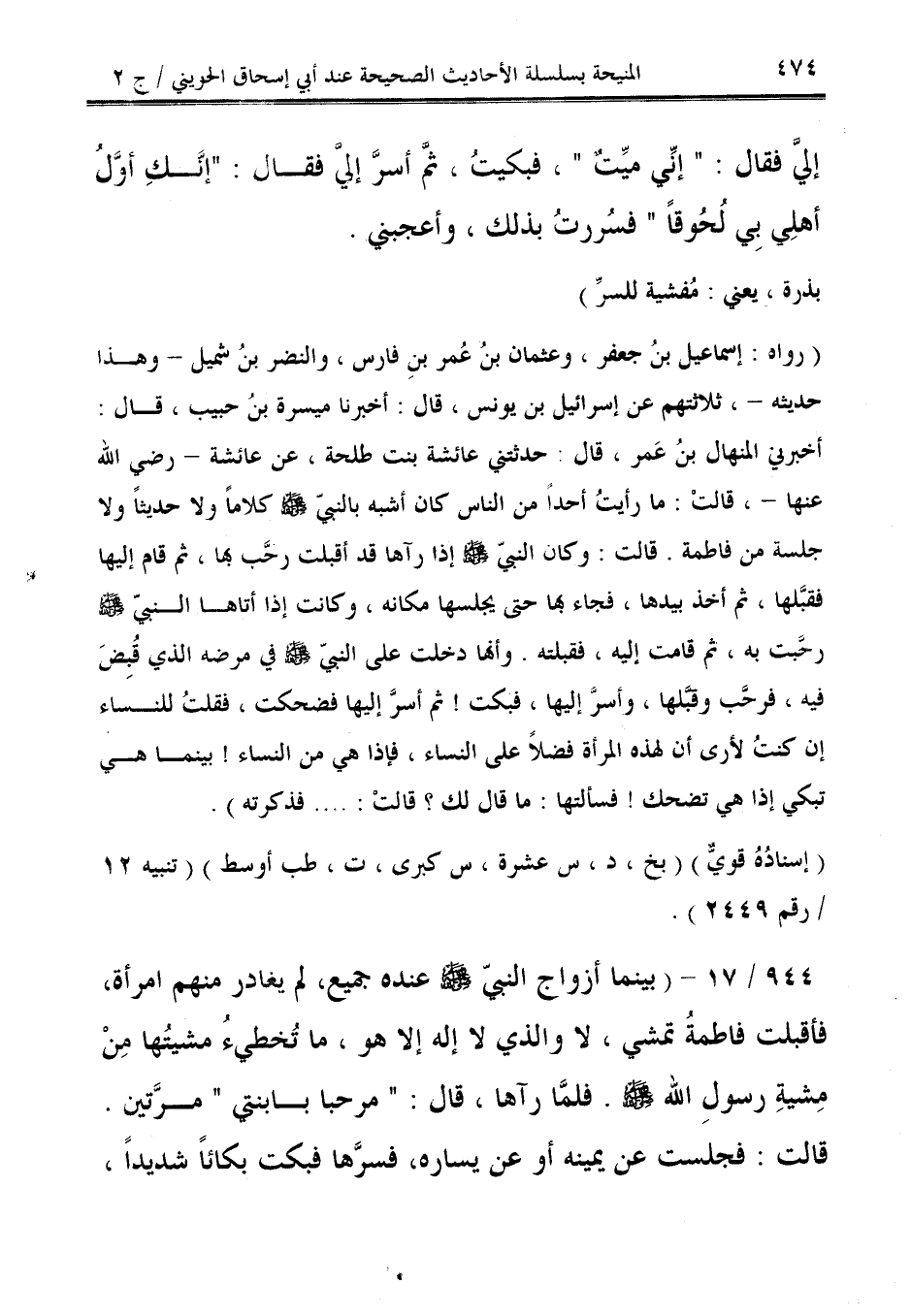 (رواه: إسماعيل بنُ جعفر، وعثمان بنُ عُمر بنِ فارس، والنضر بنُ شميل -وهذا حديثه-، ثلاثتهم عن إسرائيل بن يونس، قال: أخبرنا ميسرة بنُ حبيب، قال: أخبرني المنهال بنُ عَمر، قال. حدثتني عائشة بنت طلحة، عن عائشة - رضي الله عنها -، قالتْ: ما رأيتُ أحدًا من الناس كان أشبه بالنبيّ - صلى الله عليه وسلم - كلامًا ولا حديثًا ولا جلسة من فاطمة. قالت: وكان النبيّ - صلى الله عليه وسلم - إذا رآها قد أقبلت رحَّب بها، ثم قام إليها فقبَّلها، ثم أخذ بيدها، فجاء بها حتى يجلسها مكانه، وكانت إذا أتاها النبيّ - صلى الله عليه وسلم - رحَّبت به، ثم قامت إليه، فقبلته. وأنها دخلت على النبيّ - صلى الله عليه وسلم - في مرضه الذي قُبِضَ فيه، فرحَّب وقبَّلها، وأسرَّ إليها، فبكت! ثم أسرَّ إليها فضحكت، فقلتُ للنساء إن كنتُ لأرى أن هذه المرأة فضلًا على النساء، فإذا هي من النساء! بينما هي تبكي إذا هي تضحك! فسألتها: ما قال لك؟ قالتْ:. . . . فذكرته).