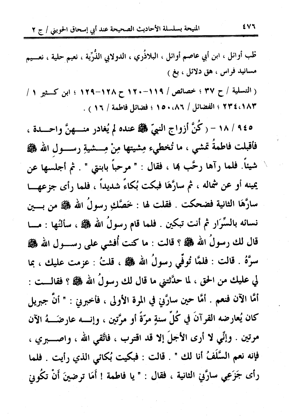 945/ 18 - (كُنَّ أزواج النبيّ - صلى الله عليه وسلم - عنده لم يُغادر منهنَّ واحدة، فأقبلت فاطمةُ تمشي، ما تُخطيء مِشيتها مِنْ مِشيةِ رسولِ الله - صلى الله عليه وسلم - شيئًا. فلما رآها رحَّب بها، فقال: "مرحبًا بابنتي". ثم أجلسها عن يمينه أو عن شماله، ثم سارَّهَا فبكت بُكاءً شديدًا، فلما رأى جزعها سارَّهَا الثانية فضحكت. فقلت لها: خَصَّكِ رسولُ الله - صلى الله عليه وسلم - من بين نسائه بالسِّرَار ثم أنت تبكين. فلما قام رسولُ الله - صلى الله عليه وسلم -، سألتُها: ما قال لك رسولُ الله - صلى الله عليه وسلم -؟ قالت: ما كنت أُفشي على رسول الله - صلى الله عليه وسلم - سرَّهُ. قالت: فلمَّا تُوفِّي رسولُ الله - صلى الله عليه وسلم -، قلتُ: عزمت عليك، بما لي عليك من الحق، لما حدَّثتني ما قال لك رسولُ الله - صلى الله عليه وسلم -؟ فقالت: أمَّا الآن فنعم. أمَّا حين سارَّني في المرة الأولى، فأخبرني: "أنَّ جبريل كان يُعارضه القرآنَ في كُل سنةٍ مرّةً أو مرَّتين، وإنه عارضَهُ الآن مرتين. وإنِّي لا أرى الأجلَ إلا قد اقترب، فاتَّقي الله، واصبري، فإنه نعم السّلَفُ أنا لك". قالت: فبكيت بُكائي الذي رأيت. فلما رأى جَزَعِي سارَّني الثانية، فقال؛ "يا فاطمة! أَمَا ترضينَ أَنْ تكُوني