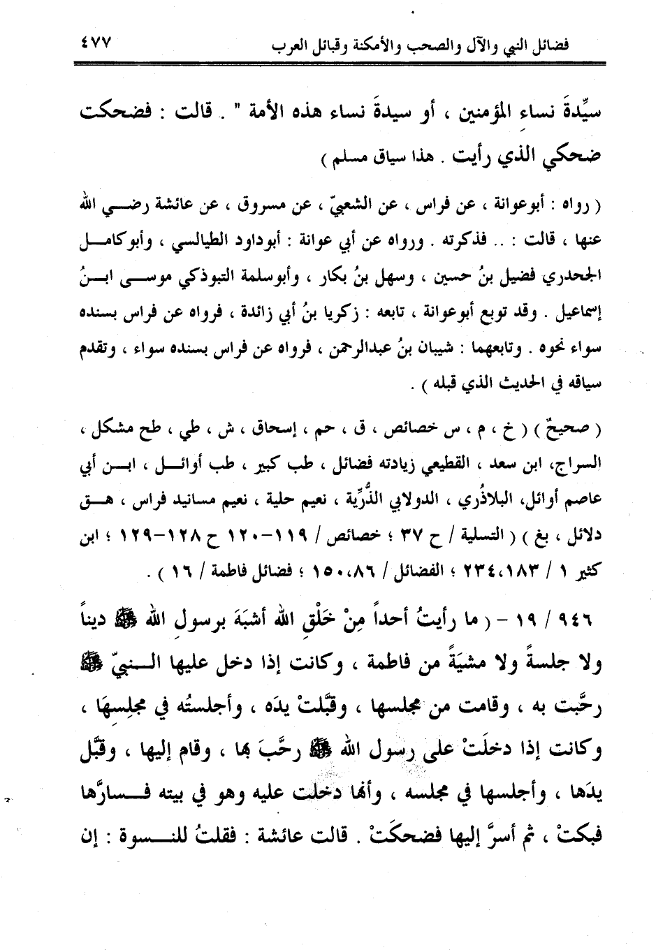 946/ 19 - (ما رأيتُ أحدًا مِنْ خَلْقِ الله أشبَهَ برسولِ الله - صلى الله عليه وسلم - دينًا ولا جلسةً ولا مشيَةً من فاطمة، وكانت إذا دخل عليها النبيّ - صلى الله عليه وسلم - رحَّبت به، وقامت من مجلسها، وقبَّلتْ يدَه، وأجلستُه في مجلِسِهَا، وكانت إذا دخلَتْ على رسول الله - صلى الله عليه وسلم - رحَّبَ بها، وقام إليها، وقبَّل يدَها، وأجلسها في مجلسه، وأنها دخلت عليه وهو في بيته فسارَّها فبكتْ، ثم أسرَّ إليها فضحكَتْ. قالت عائشة: فقلتُ للنسوة: إن