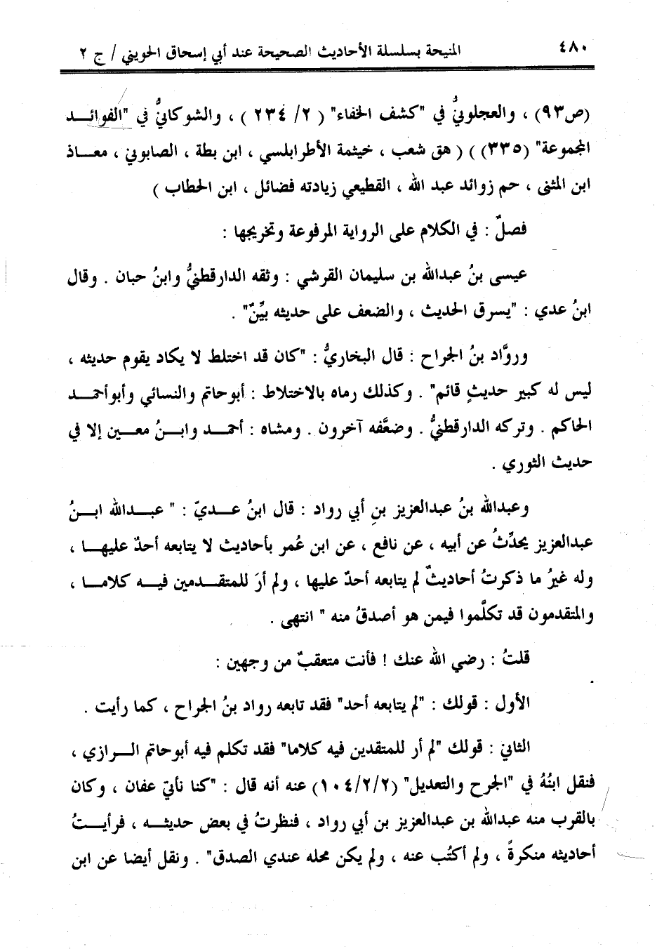 الثاني: قولك "لم أر للمتقدين فيه كلاما" فقد تكلم فيه أبو حاتم الرازي، فنقل ابنُهُ في "الجرح والتعديل" (2/ 2 / 104) عنه أنه قال: "كنا نأتي عفان، وكان بالقرب منه عبد الله بن عبد العزيز بن أبي رواد، فنظرتُ في بعض حديثه، فرأيتُ أحاديثه منكرةً، ولم أكتُب عنه، ولم يكن محله عندي الصدق". ونقل أيضًا عن ابن