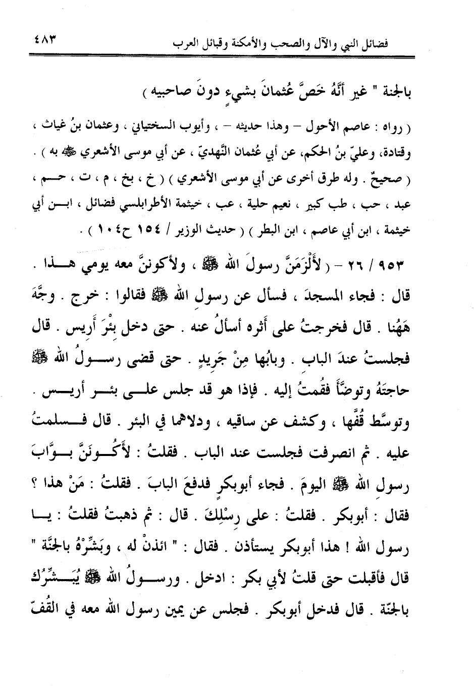 953/ 26 - (لألْزَمَنَّ رسولَ الله - صلى الله عليه وسلم -، ولأكوننَّ معه يومي هذا. قال: فجاء المسجدَ، فسأل عن رسولِ الله - صلى الله عليه وسلم - فقالوا: خرج. وجَّهَ هَهُنا. قال فخرجتُ على أَثره أسألُ عنه. حتى دخل بِئْرَ أَرِيس. قال فجلستُ عندَ البابِ. وبابُها مِنْ جَرِيدٍ. حتى قضى رسولُ الله - صلى الله عليه وسلم - حاجتَهُ وتوضَّأَ فقمتُ إليه. فإذا هو قد جلس على بئر أريس. وتوسَّط قُفَّها، وكشف عن ساقيه، ودلاهما في البئر. قال فسلمتُ عليه. ثم انصرفت فجلست عند الباب. فقلتُ: لأَكُونَنَّ بوَّابَ رسولِ الله - صلى الله عليه وسلم - اليومَ. فجاء أبو بكرٍ فدفعَ البابَ. فقلتُ: مَنْ هذا؟ فقال: أبو بكر. فقلتُ: على رِسْلِكَ. قال: ثم ذهبتُ فقلتُ: يا رسول الله! هذا أبو بكر يستأذن. فقال: "ائذنْ له، وبَشِّرْهُ بالجنَّة" قال فأقبلت حتى قلتُ لأبي بكر: ادخل. ورسولُ الله - صلى الله عليه وسلم - يُبشِّرُك بالجنّة. قال فدخل أبو بكر. فجلس عن يمين رسول الله معه في القُفّ