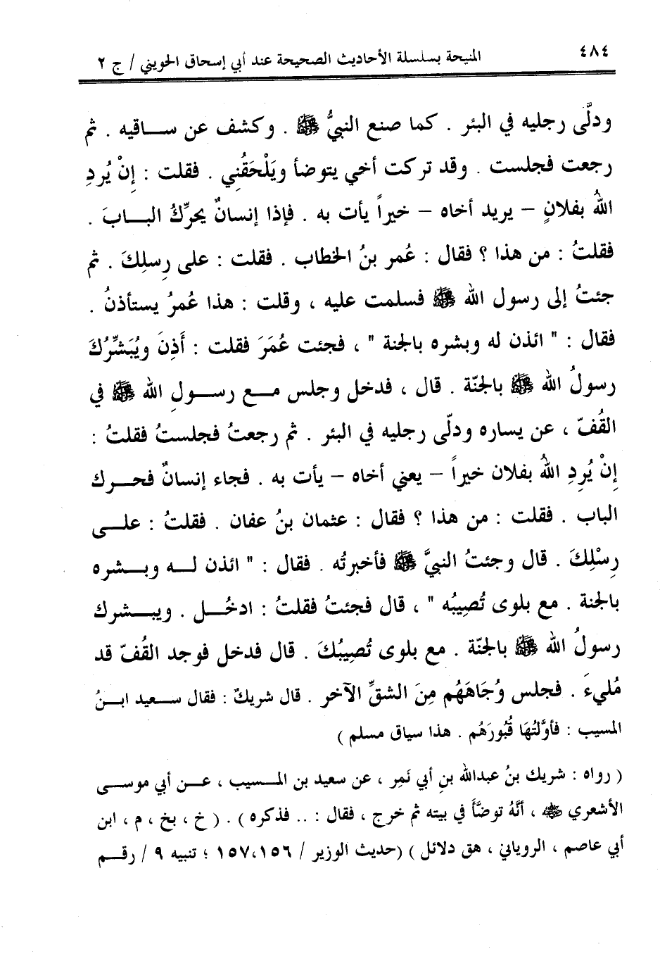 ودلَّى رجليه في البئر. كما صنع النبيُّ - صلى الله عليه وسلم -. وكشف عن ساقيه. ثم رجعت فجلست. وقد تركت أخي يتوضأ ويَلْحَقُنِي. فقلت: إِنْ يُردِ الله بفلانٍ -يريد أخاه- خيرًا يأت به. فإذا إنسانٌ يحرِّكُ البابَ. فقلتُ: من هذا؟ فقال: عُمر بنُ الخطاب. فقلت: على رِسلِكَ. ثم جئتُ إلى رسول الله - صلى الله عليه وسلم - فسلمت عليه، وقلت: هذا عُمرُ يستأذنُ. فقال: "ائذن له وبشره بالجنة"، فجئت عُمَرَ فقلت: أَذِنَ ويُبَشِّرُكَ رسولُ الله - صلى الله عليه وسلم - بالجنّة. قال، فدخل وجلس مع رسولِ الله - صلى الله عليه وسلم - في القُفّ، عن يساره ودلّى رجليه في البئر. ثم رجعتُ فجلستُ فقلتُ: إِنْ يُرِدِ الله بفلان خيرًا -يعني أخاه- يأت به. فجاء إنسانٌ فحرك الباب. فقلت: من هذا؟ فقال: عثمان بنُ عفان. فقلتُ: على رِسْلِكَ. قال وجئتُ النبيَّ - صلى الله عليه وسلم - فأخبرتُه. فقال: "ائذن له وبشره بالجنة. مع بلوى تُصِيبُه"، قال فجئتُ فقلتُ: ادخُل. ويبشرك رسولُ الله - صلى الله عليه وسلم - بالجنّة. مع بلوى تُصِيبُكَ. قال فدخل فوجد القُفّ قد مُليءَ. فجلس وُجَاهَهُم مِنَ الشقِّ الآخر. قال شريكٌ: فقال سعيد ابنُ المسيب: فأوَّلتُهَا قُبُورَهُم. هذا سياق مسلم).