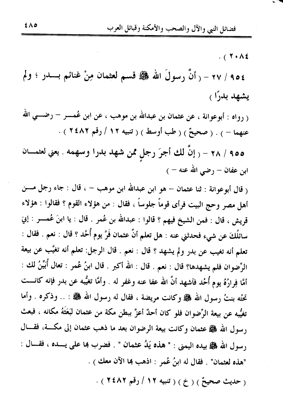 955/ 28 - (إنَّ لك أجرَ رجلٍ ممن شهد بدرا وسهمه. يعني لعثمان ابن عفان - رضي الله عنه -).