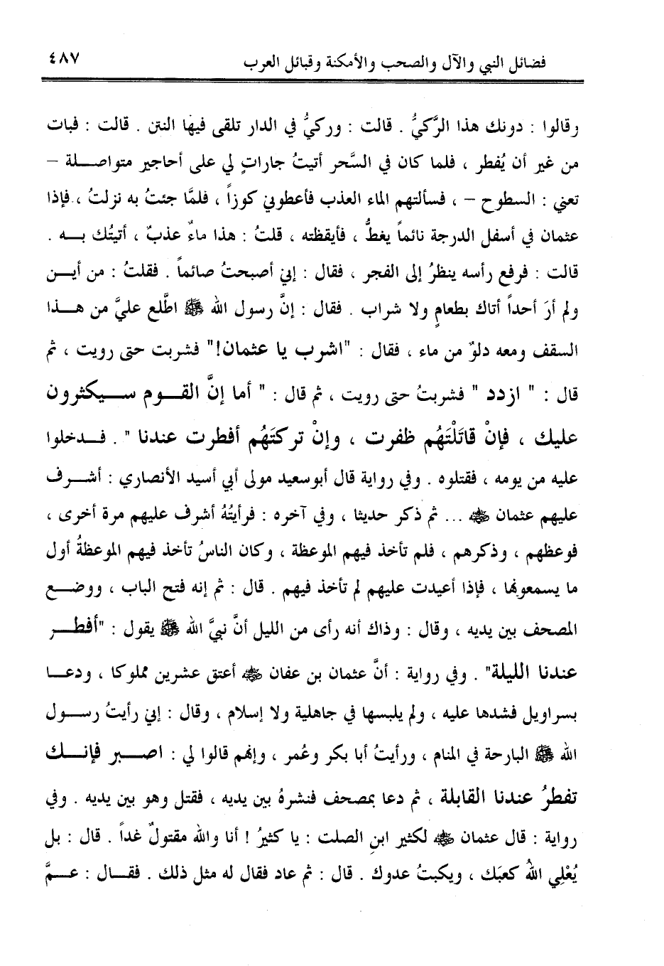 وقالوا: دونك هذا الرَّكيُّ. قالت: وركيُّ في الدار تلقى فيها النتن. قالت: فبات من غير أن يُفطر، فلما كان في السَّحر أتيتُ جاراتٍ في على أحاجير متواصلة -تعني: السطوح-، فسألتهم الماء العذب فأعطوني كوزًا، فلمَّا جئتُ به نزلتُ، فإذا عثمان في أسفل الدرجة نائمًا يغطُّ، فأيقظته، قلتُ: هذا ماءٌ عذبٌ، أتيتُك به. قالت: فرفع رأسه ينظرُ إلى الفجر، فقال: إني أصبحتُ صائمًا. فقلتُ: من أين ولم أرَ أحدًا أتاك بطعامٍ ولا شراب. فقال: إن رسول الله - صلى الله عليه وسلم - اطّلع عليَّ من هذا السقف ومعه دلوٌ من ماء، فقال: "اشرب يا عثمان" فضربت حتى رويت، ثم قال: "ازدد" فشربتُ حتى رويت، ثم قال: "أما إنّ القوم سيكثرون عليك، فإنْ قاتَلْتَهُم ظفرت، وإنْ تركتَهُم أفطرت عندنا". فدخلوا عليه من يومه، فقتلوه. وفي رواية قال أبو سعيد مولى أبي أسيد الأنصاري: أشرف عليهم عثمان - رضي الله عنه - ... ثم ذكر حديثًا، وفي آخره: فرأيتُهُ أشرف عليهم مرة أخرى، فوعظهم، وذكرهم، فلم تأخذ فيهم الموعظة، وكان الناسُ تأخذ فيهم الموعظةُ أول ما يسمعونها، فإذا أعيدت عليهم لم تأخذ فيهم. قال: ثم إنه فتح الباب، ووضع المصحف بين يديه، وقال: وذاك أنه رأى من الليل أنَّ نبيَّ الله - صلى الله عليه وسلم - يقول: "أفطر عندنا الليلة". وفي رواية: أنَّ عثمان بن عفان - رضي الله عنه - أعتق عشرين مملوكا، ودعا بسراويل فشدها عليه، ولم يلبسها في جاهلية ولا إسلام، وقال: إني رأيتُ رسول الله - صلى الله عليه وسلم - البارحة في المنام، ورأيتُ أبا بكر وعُمر، وإنهم قالوا لي: اصبر فإنك تفطرُ عندنا القابلة، ثم دعا بمصحف فنشرهُ بين يديه، فقتل وهو بين يديه. وفي رواية: قال عثمان - رضي الله عنه - لكثير ابنِ الصلت: يا كثيرُ! أنا والله مقتولٌ غدًا. قال: بل يُعْلِي الله كعبَك، ويكبتُ عدوك. قال: ثم عاد فقال له مثل ذلك. فقال: عمَّ