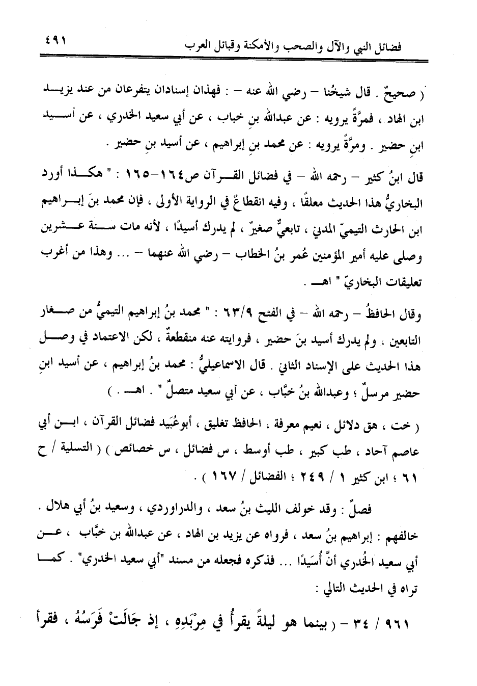 وقال الحافظُ - رحمه الله - في الفتح 9/ 63: "محمد بنُ إبراهيم التيميُّ من صغار التابعين، ولم يدرك أسيد بنَ حضير، فروايته عنه منقطعةٌ، لكن الاعتماد في وصل هذا الحديث على الإسناد الثاني. قال الإسماعيليُّ: محمد بنُ إبراهيم، عن أسيد ابنِ حضير مرسلٌ؛ وعبد الله بنُ خبَّاب، عن أبي سعيد متصلٌ". اهـ.).