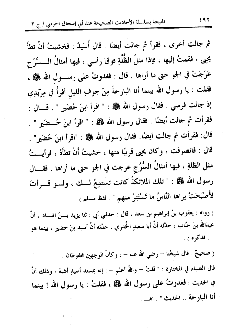 (رواه: يعقوب بنُ إبراهيم بنِ سعد، قال: حدثني أبي: ثنا يزيد بنُ الهاد، أنَّ عبد الله بنَ خبَّاب، حدَّثه أنَّ أبا سعيدٍ الخُدري، حدَّثه أن أسيد بنَ حضير، بينما هو ... فذكره).