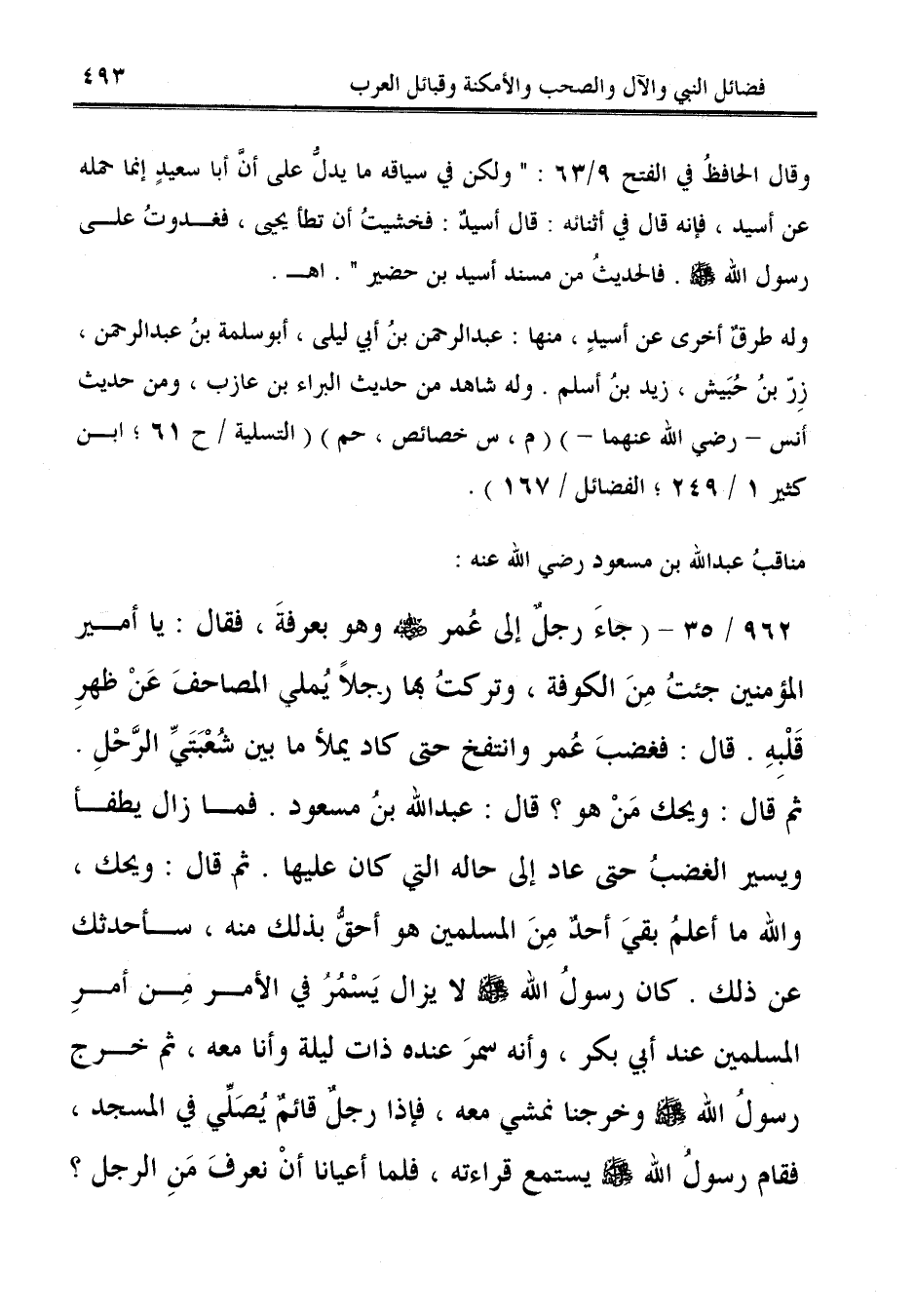 962/ 35 - (جاءَ رجلٌ إلى عُمر - رضي الله عنه - وهو بعرفةَ، فقال: يا أمير المؤمنين جئتُ مِنَ الكوفة، وتركتُ بها رجلًا يُملي المصاحفَ عَنْ ظهرِ قَلْبِهِ. قال: فغضبَ عُمر وانتفخ حتى كاد يملأ ما بين شُعْبَتَيِّ الرَّحْلِ. ثم قال: ويحك مَنْ هو؟ قال: عبد الله بن مسعود. فما زال يطفأ ويسير الغضبُ حتى عاد إلى حاله التي كان عليها. ثم قال: ويحك، والله ما أعلمُ بقيَ أحدٌ مِنَ المسلمين هو أحقُّ بذلك منه، سأحدثك عن ذلك. كان رسولُ الله - صلى الله عليه وسلم - لا يزال يَسْمُرُ في الأمر مِن أمرِ المسلمين عند أبي بكر، وأنه سمرَ عنده ذات ليلة وأنا معه، ثم خرج رسولُ الله - صلى الله عليه وسلم - وخرجنا نمشي معه، فإذا رجلٌ قائمٌ يُصَلِّي في المسجد، فقام رسولُ الله - صلى الله عليه وسلم - يستمع قراءته، فلما أعيانا أنْ نعرفَ مَنِ الرجل؟
