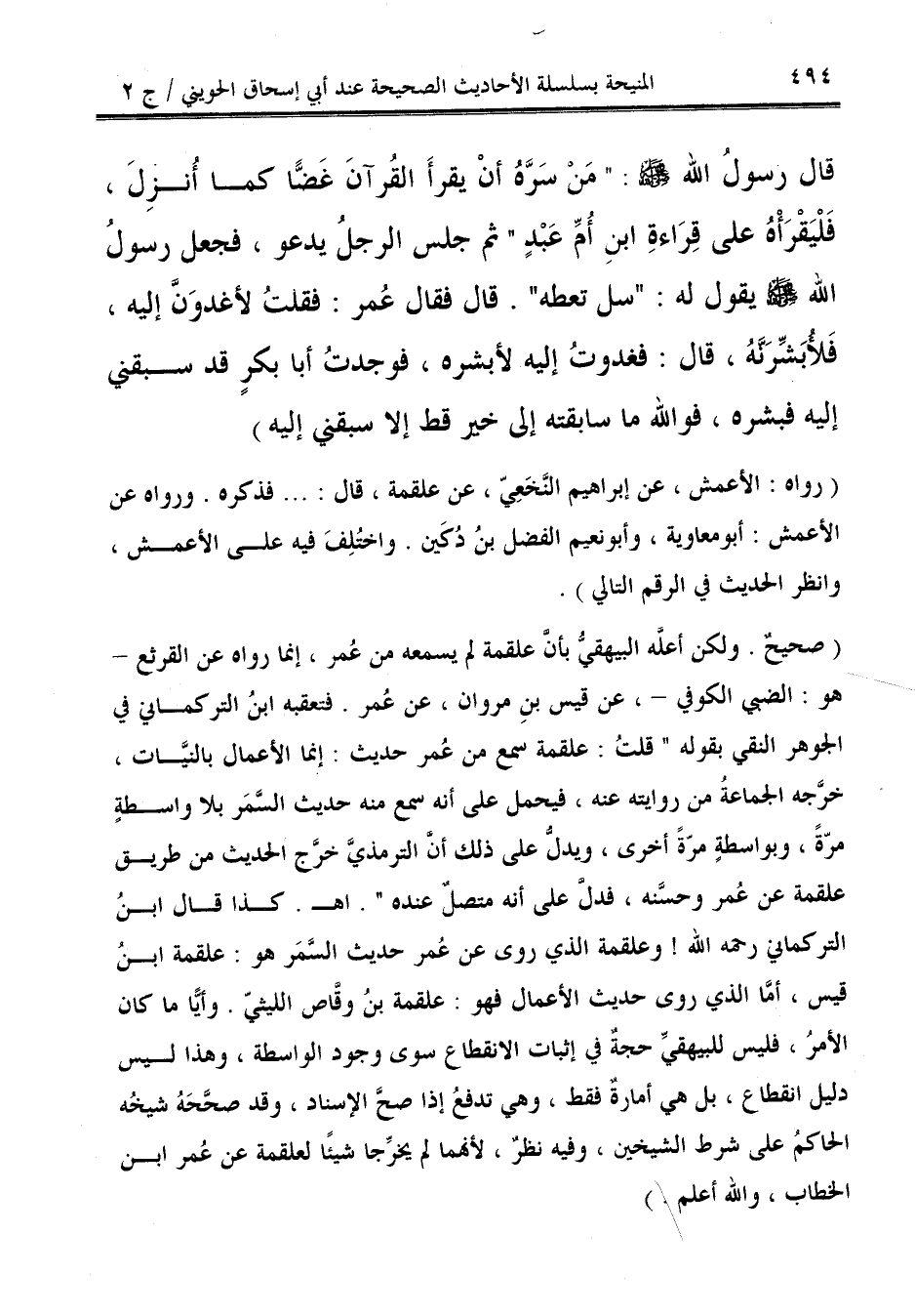 (صحيحٌ. ولكن أعلَّه البيهقيُّ بأنَّ علقمة لم يسمعه من عُمر، إنما رواه عن القرثع -هو: الضبي الكوفي-، عن قيس بنِ مروان، عن عُمر. فتعقبه ابنُ التركماني في الجوهر النقي بقوله "قلتُ: علقمة سمع من عُمر حديث: إنما الأعمال بالنَّيات، خرَّجه الجماعةُ من روايته عنه، فيحمل على أنه سمع منه حديث السَّمَر بلا واسطةٍ مرّةً، وبواسطةٍ مرّةً أخرى، ويدلُّ على ذلك أنَّ الترمذيَّ خرَّج الحديث من طريق علقمة عن عُمر وحسَّنه، فدلٌ على أنه متصلٌ عنده". اهـ. كذا قال ابنُ التركماني رحمه الله! وعلقمة الذي روى عن عُمر حديث السَّمَر هو: علقمة ابنُ قيس، أمَّا الذي روى حديث الأعمال فهو: علقمة بنُ وقَّاص الليثيّ. وأيًّا ما كان الأمرُ، فليس للبيهقيِّ حجةٌ في إثبات الانقطاع سوى وجود الواسطة، وهذا ليس دليل انقطاع، بل هي أمارةٌ فقط، وهي تدفعُ إذا صحَّ الإسناد، وقد صحَّحَهُ شيخُه الحاكمُ على شرط الشيخين، وفية نظرٌ، لأنهما لم يخرِّجا شيئًا لعلقمة عن عُمر ابن الخطاب، والله أعلم.)
