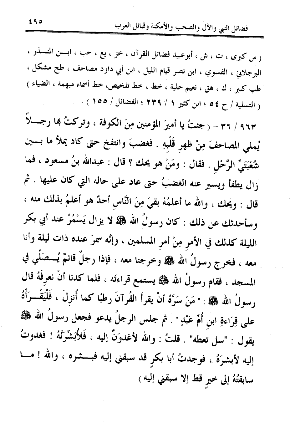 963/ 36 - (جئتُ يا أميرَ المؤمنين مِنَ الكوفة، وتركتُ بها رجلًا يُملي المصاحفَ مِنْ ظهرِ قَلْبِهِ. فغضبَ وانتفخ حتى كاد يملأ ما بين شُعْبَتَيِّ الرَّحْلِ. فقال: ومَنْ هو يحك؟ قال: عبد الله بنُ مسعود، فما زال يطفأ ويسير عنه الغضبُ حتى عاد على حاله التي كان عليها. ثم قال: ويحك، والله ما أعلمُهُ بقيَ مِنَ الناسِ أحدٌ هو أعلمُ بذلك منه، وسأحدثك عن ذلك: كان رسولُ الله - صلى الله عليه وسلم - لا يزال يَسْمُرُ عند أبي بكر الليلة كذلك في الأمرِ مِنْ أمرِ المسلمين، وإنَّه سمرَ عنده ذات ليلة وأنا معه، فخرج رسولُ الله - صلى الله عليه وسلم - وخرجنا معه، فإذا رجلٌ قائمٌ يُصَلِّي في المسجد، فقام رسولُ الله - صلى الله عليه وسلم - يستمع قراءتَه، فلما كدنا أنْ نعرِفَهُ قال رسولُ الله - صلى الله عليه وسلم -: "مَنْ سَرَّهُ أنْ يقرأَ القُرآنَ رطبًا كما أُنزِلَ، فَلْيَقْرَأهُ على قِرَاءةِ ابنِ أُمِّ عَبْدٍ". ثم جلس الرجلُ يدعو فجعل رسولُ الله - صلى الله عليه وسلم - يقول: "سل تعطه". قلتُ: والله لأغدوَنَّ إليه، فَلأُبَشِّرَنَهُ! فغدوتُ إليه لأبشرَهُ، فوجدتُ أبا بكرٍ قد سبقني إليه فبشره، والله! ما سابقتُهُ إلى خيرٍ قط إلا سبقني إليه)