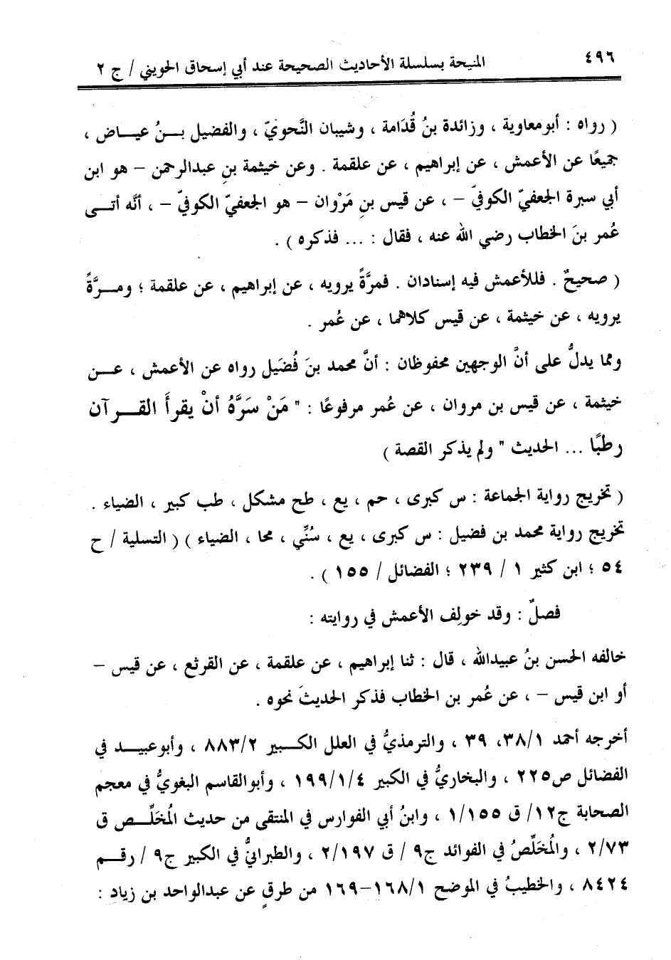 (صحيحٌ. فللأعمش فيه إسنادان. فمرَّةً يرويه، عن إبراهيم، عن علقمة؛ ومرَّةً يرويه، عن خيثمة، عن قيس كلاهما، عن عُمر.