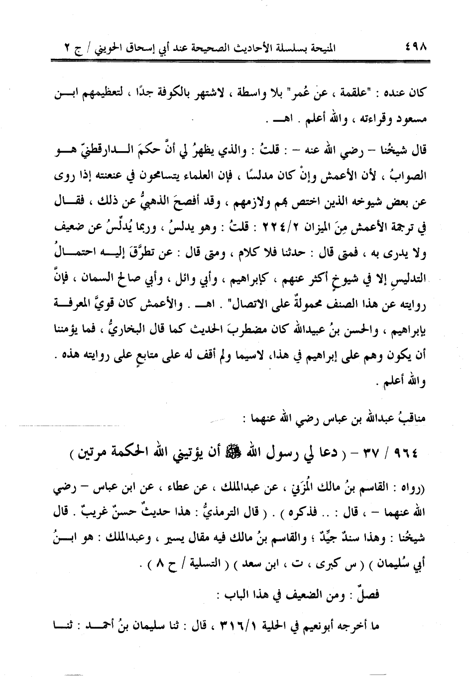 قال شيخُنا - رضي الله عنه -: قلتُ: والذي يظهرُ لي أنَّ حكمَ الدارقطنيّ هو الصوابُ، لأن الأعمش وإنْ كان مدلسًا، فإن العلماء يتسامحون في عنعنته إذا روى عن بعض شيوخه الذين اختص بهم ولازمهم، وقد أفصحَ الذهبيُّ عن ذلك، فقال في ترجمة الأعمش مِنَ الميزان 2/ 224: قلتُ: وهو يدلسُ، وربما يُدلِّسُ عن ضعيف ولا يدرى به، فمتى قال: حدثنا فلا كلام، ومتى قال: عن تطرَّقَ إليه احتمالُ التدليسِ إلا في شيوخٍ أكثر عنهم، كإبراهيم، وأبي وائل، وأبي صالح السمان، فإنَّ روايته عن هذا الصنف محمولةٌ على الاتصال". اهـ. والأعمش كان قويَّ المعرفة بإبراهيم، والحسن بنُ عبيد الله كان مضطربَ الحديث كما قال البخاريُّ، فما يؤمننا أن يكون وهم على إبراهيم في هذا، لا سيما ولم أقف له على متابعٍ على روايته هذه. والله أعلم.