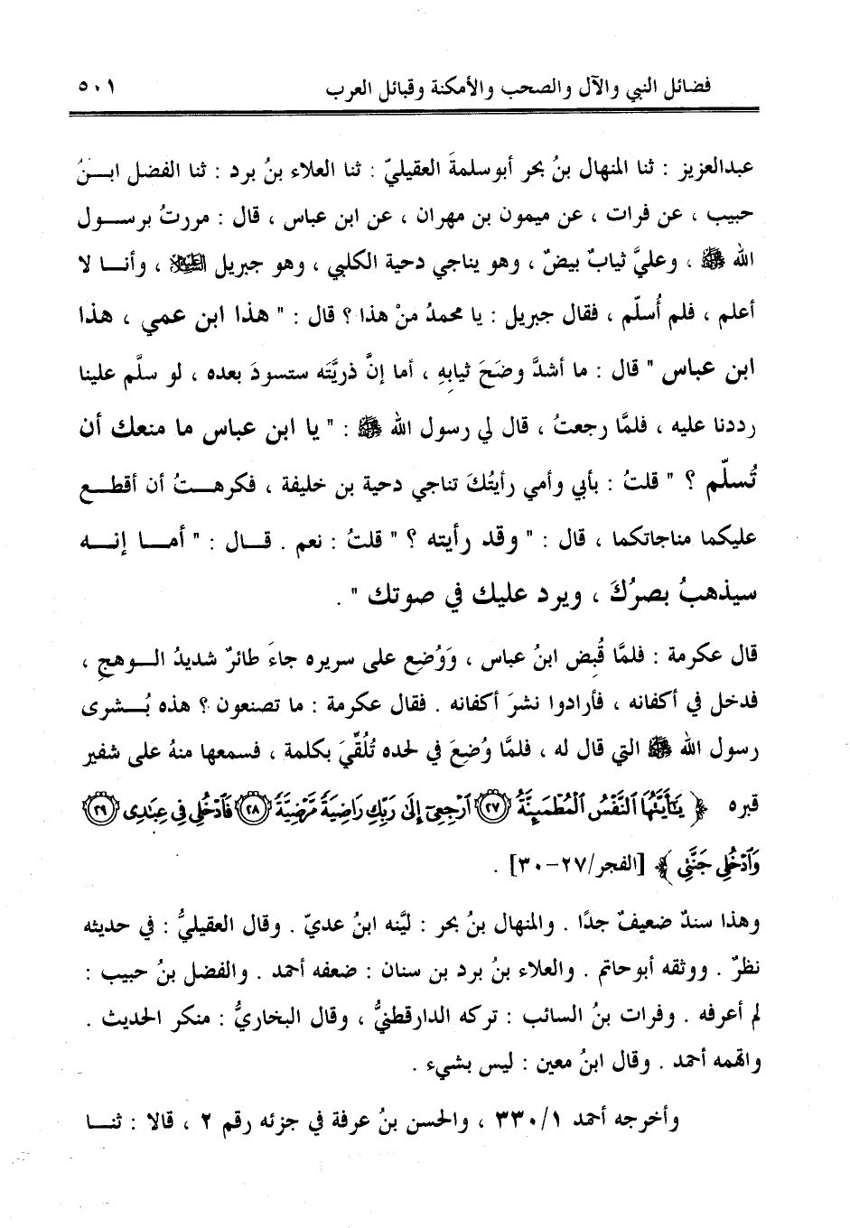 عبد العزيز: ثنا المنهال بنُ بحر أبو سلمةَ العقيليّ: ثنا العلاء بنُ برد: ثنا الفضل ابن حبيب، عن فرات، عن ميمون بن مهران، عن ابن عباس، قال: مررتُ برسول الله - صلى الله عليه وسلم -، وعليَّ ثيابٌ بيضٌ، وهو يناجي دحية الكلبي، وهو جبريل - عليه السلام - وأنا لا أعلم، فلم أُسلّم، فقال جبريل: يا محمدُ منْ هذا؟ قال: "هذا ابن عمي، هذا ابن عباس" قال: ما أشدَّ وضَحَ ثيابِهِ، أما إنَّ ذريَّتَه ستسودَ بعده، لو سلَّم علينا رددنا عليه، فلمَّا رجعتُ، قالَ لي رسول الله - صلى الله عليه وسلم -: "يا ابن عباس ما منعك أن تُسلّم؟ " قلتُ: بأبي وأمي رأيتُكَ تناجي دحية بن خليفة، فكرهتُ أن أقطع عليكما مناجاتكما، قال: "وقد رأيته؟ " قلتُ: نعم. قال: "أما إنه سيذهبُ بصرُكَ، ويرد عليك في صوتك".