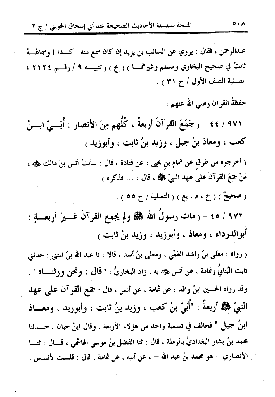 971/ 44 - (جَمَعَ القرآنَ أربعة، كُلُّهم مِنَ الأنصار: أُبَيّ ابنُ كعب، ومعاذ بنُ جبل، وزيد بنُ ثابت، وأبو زيد).