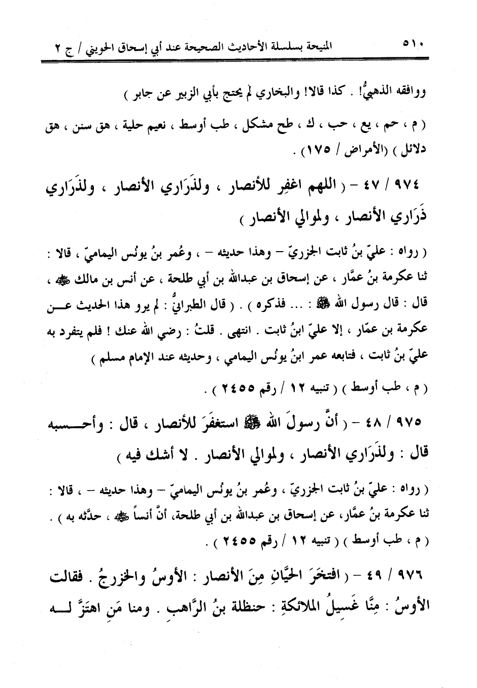 (رواه: عليّ بنُ ثابت الجزريّ، وعُمر بنُ يونس اليماميّ -وهذا حديثه-، قالا: ثنا عكرمة بنُ عمَّار، عن إسحاق بن عبد الله بن أبي طلحة، أنَّ أنسًا - رضي الله عنه -، حدَّثه به). (م، طب أوسط) (تنبيه 12 / رقم 2455).