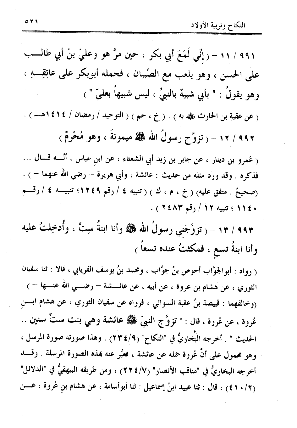 993/ 13 - (تزوَّجَنِي رسولُ الله - صلى الله عليه وسلم - وأنا ابنةُ سِتٍّ، وأُدخِلتُ عليه وأنا ابنةُ تسعٍ، فمكثتُ عنده تسعًا).