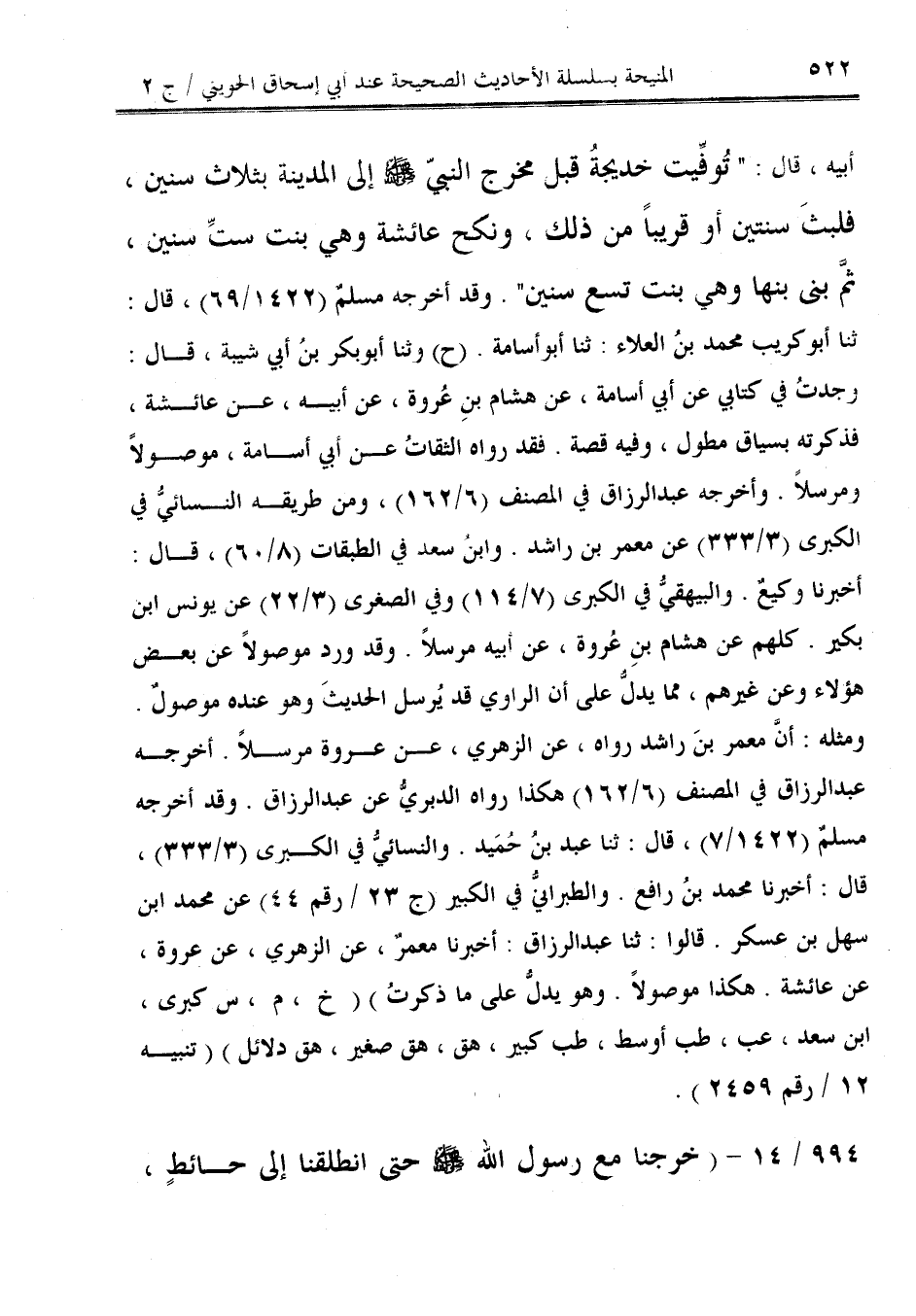 أبية، قال: تُوفِّيت خديجةُ قبل مخرج النبيّ - صلى الله عليه وسلم - إلى المدينة بثلاث سنين، فلبثَ سنتين أو قريبًا من ذلك، ونكح عائشة وهي بنت ستِّ سنين، ثمَّ بنى بها وهي بنت تسع سنين". وقد أخرجه مسلمٌ (1422/ 69)، قال: ثنا أبو كريب محمد بنُ العلاء: ثنا أبو أسامة. (ح) وثنا أبو بكر بن أبي شيبة، قال: وجدتُ في كتابي عن أبي أسامة، عن هشام بنِ عُروة، عن أبيه، عن عائشة، فذكرته بسياق مطول، وفيه قصة. فقد رواه الثقاتُ عن أبي أسامة، موصولًا ومرسلًا. وأخرجه عبد الرزاق في المصنف (6/ 162)، ومن طريقه النسائيُّ في الكبرى (3/ 333) عن معمر بن راشد. وابن سعد في الطبقات (8/ 60)، قال: أخبرنا وكيعٌ. والبيهقيُّ في الكبرى (7/ 114) وفي الصغرى (3/ 22) عن يونس ابن بكير. كلهم عن هشام بنِ عُروة، عن أبيه مرسلًا. وقد ورد موصولًا عن بعض هؤلاء وعن غيرهم، مما يدلُّ على أن الراوي قد يُرسل الحديثَ وهو عنده موصول. ومثله: أنَّ معمر بنَ راشد رواه، عن الزهري، عن عروة مرسلًا. أخرجه عبد الرزاق في المصنف (6/ 162) هكذا رواه الدبريُّ عن عبد الرزاق. وقد أخرجه مسلمٌ (1422/ 7)، قال: ثنا عبد بنُ حُمَيد. والنسائيُّ في الكبرى (3/ 333)، قال: أخبرنا محمد بنُ رافع. والطبرانيُّ في الكبير (ج 23 / رقم 44) عن محمد ابن سهل بن عسكر. قالوا: ثنا عبد الرزاق: أخبرنا معمرٌ، عن الزهري، عن عروة، عن عائشة. هكذا موصولًا. وهو يدلّ على ما ذكرتُ) (خ، م، س كبرى، ابن سعد، عب، طب أوسط، طب كبير، هق، هق صغر، هق دلائل (تنبيه 12 / رقم 2459).