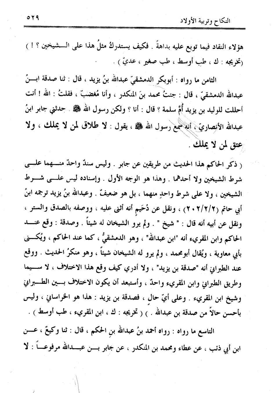 الثامن ما رواه: أبو بكر الدمشقيّ عبد الله بنُ يزيد، قال: ثنا صدقة ابنُ عبد الله الدمشقيّ، قال: جئتُ محمد بنَ المنكدر، وأنا مُغضبٌ، فقلتُ: الله! أنت أحللت للوليد بن يزيد أُمَّ سلمة؟ قال: أنا؟ ولكن رسول الله - صلى الله عليه وسلم - حدثني جابر ابنُ عبد الله الأنصاريّ، أنه سمع رسول الله - صلى الله عليه وسلم -، يقول: لا طلاق لمن لا يملك، ولا عتق لمن لا يملك.