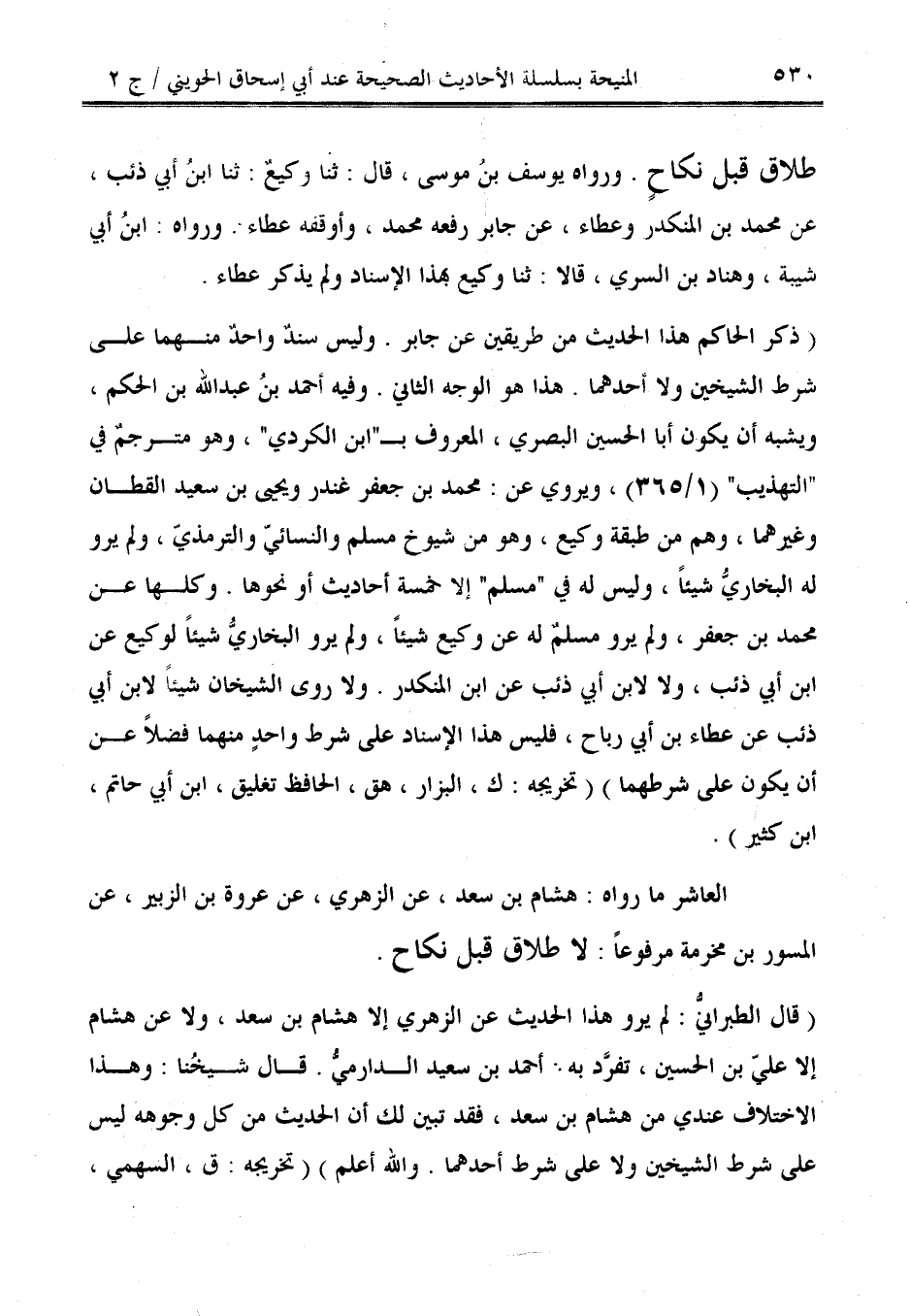 طلاق قبل نكاحٍ. ورواه يوسف بنُ موسى، قال: ثنا وكيعٌ: ثنا ابنُ أبي ذئب، عن محمد بن المنكدر وعطاء، عن جابر رفعه محمد، وأوقفه عطاء. ورواه: ابنُ أبي شيبة، وهناد بن السري، قالا: ثنا وكيع بهذا الإسناد ولم يذكر عطاء.