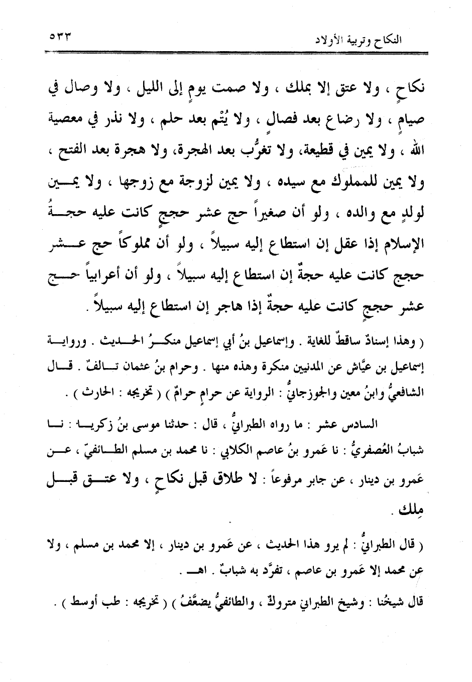 السادس عشر: ما رواه الطبرانيُّ، قال: حدثنا موسى بنُ زكريا: نا شبابُ العُصفريُّ: نا عَمرو بنُ عاصم الكلابي: نا محمد بن مسلم الطائفيّ، عن عَمرو بن دينار، عن جابر مرفوعًا: لا طلاق قبل نكاحٍ، ولا عتق قبل مِلك.